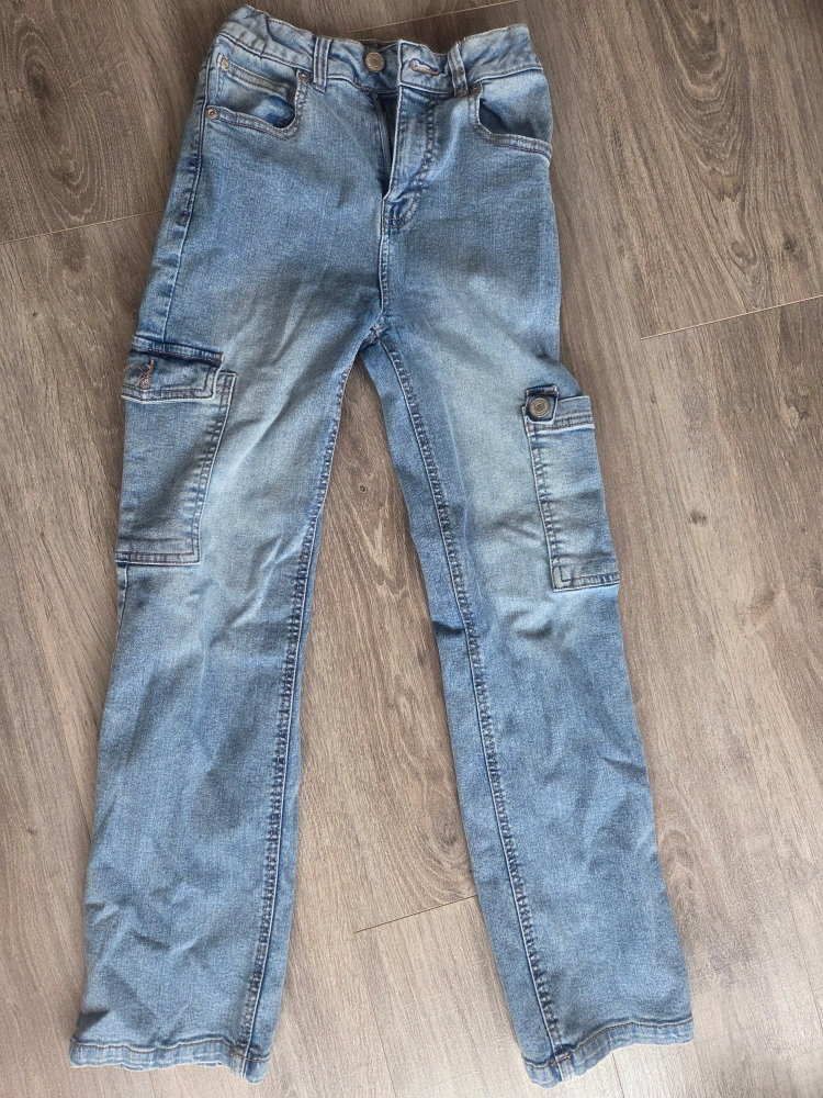 Selling a pair of kids' cargo jeans. They're in great shape and ready for a new home! The light wash denim is perfect for everyday wear, and the cargo pockets add a cool, functional touch