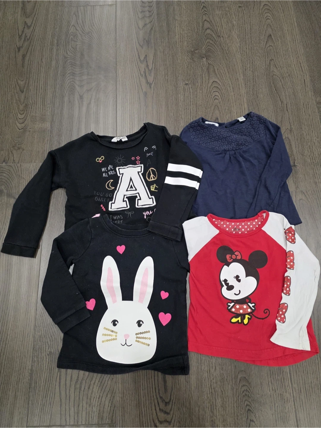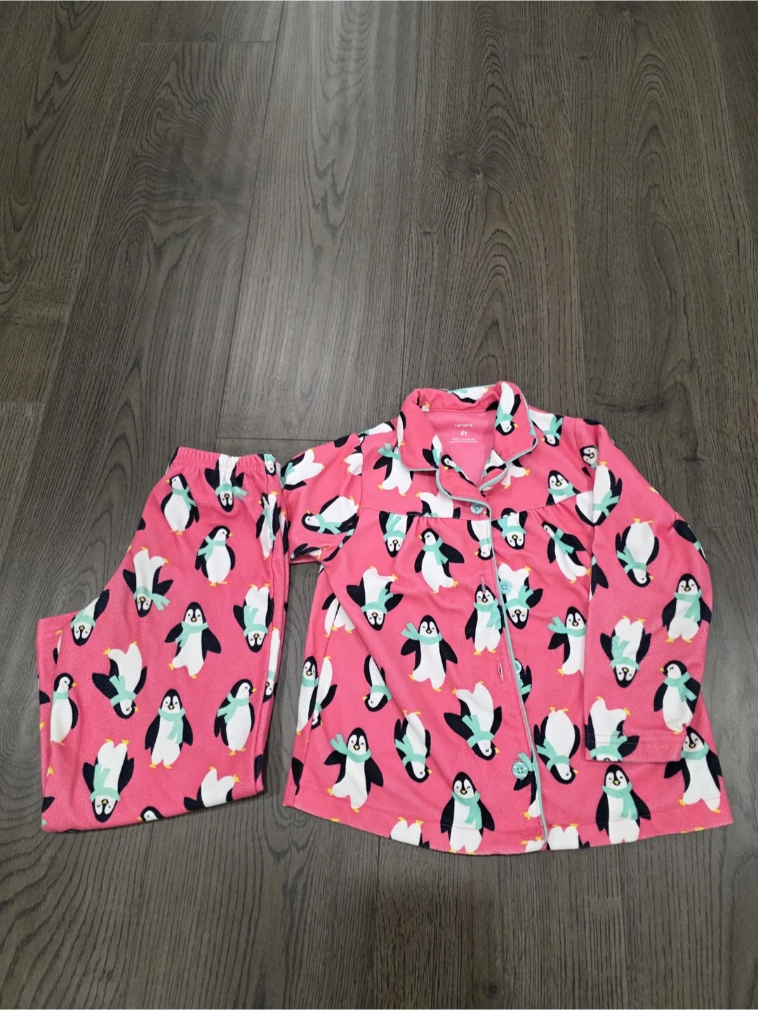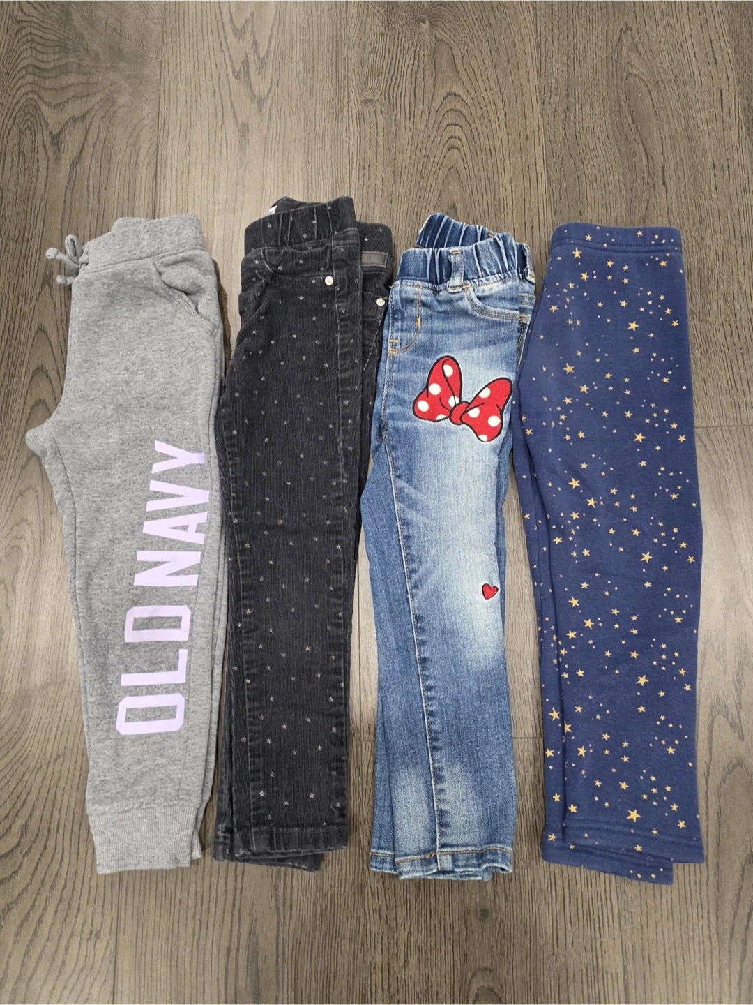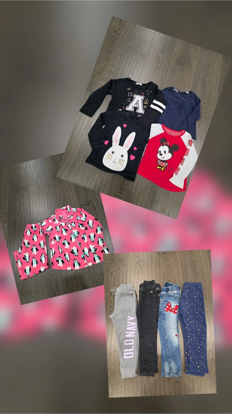 10Selling a bundle of kids' clothes, size 4T Includes Old Navy leggings, jeans with a Minnie Mouse design, and a few cute tops. Also comes with a pink penguin pajama set! Great for everyday wear.