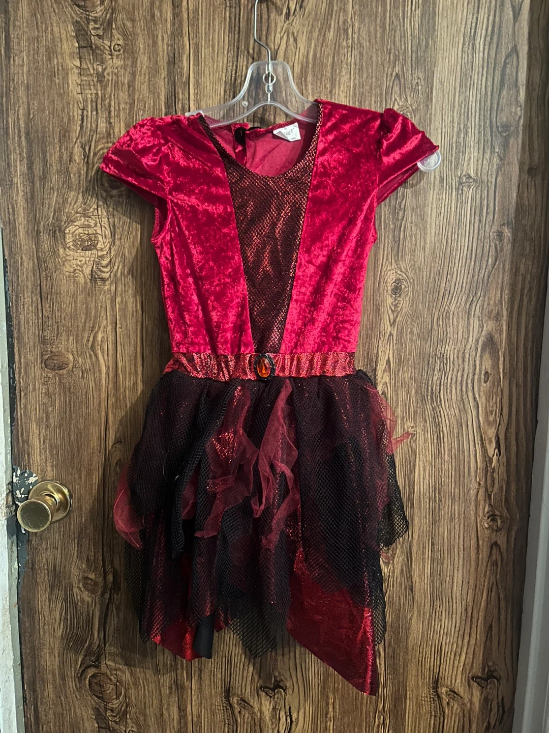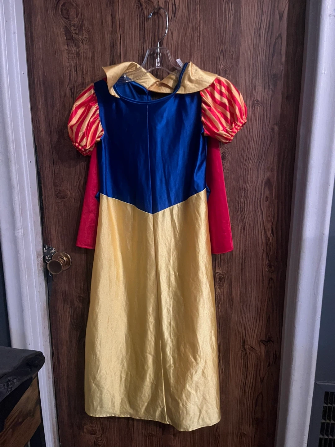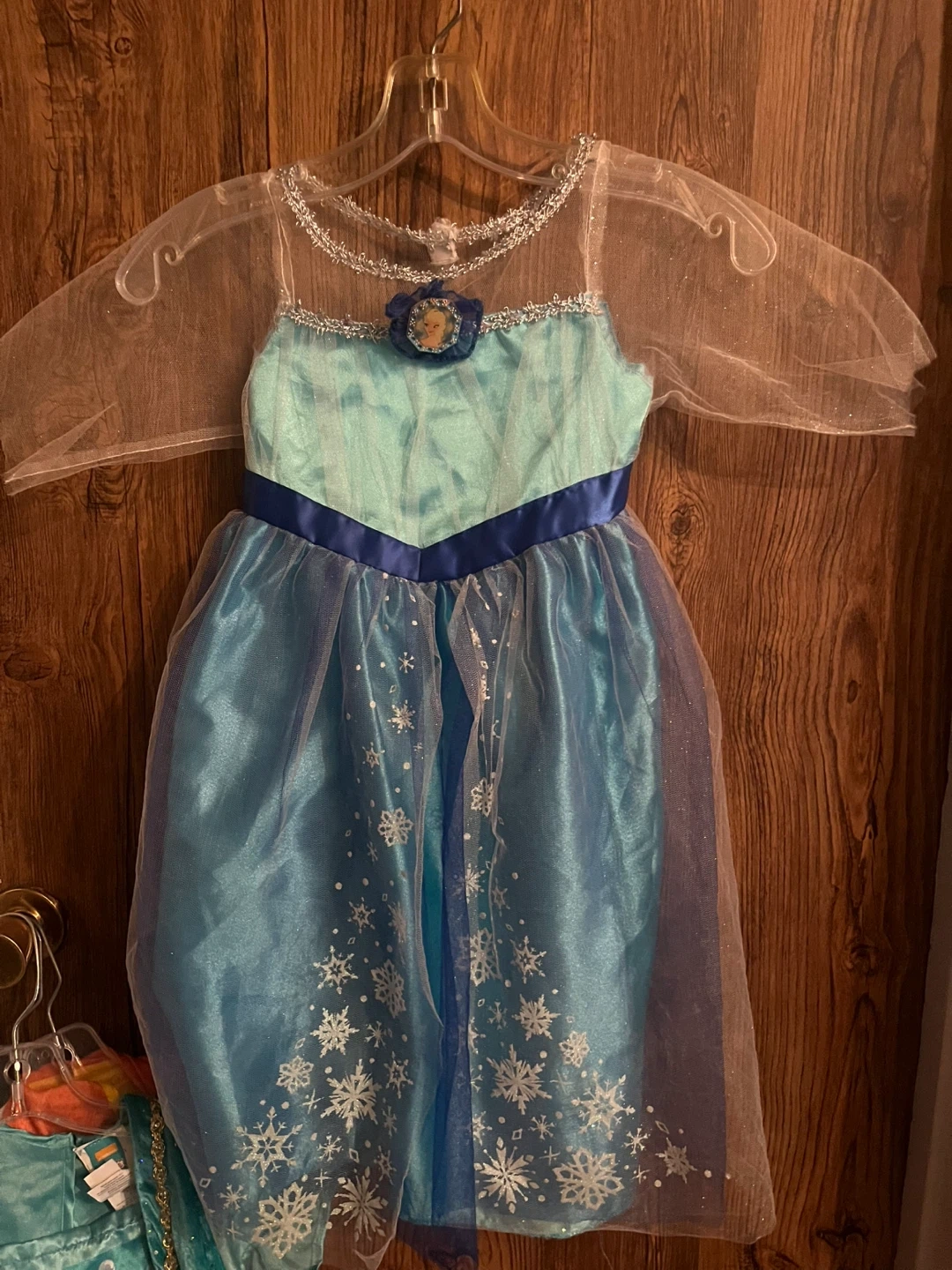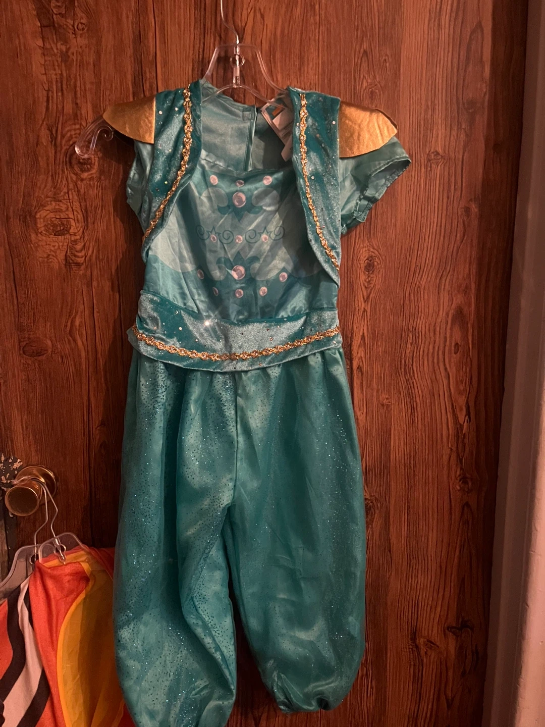 Selling a bundle of kids' costumes. Includes an Elsa dress, a red witch costume, a panda onesie, a Jasmine costume and a dinosaur onesie. Perfect for dress-up or Halloween!