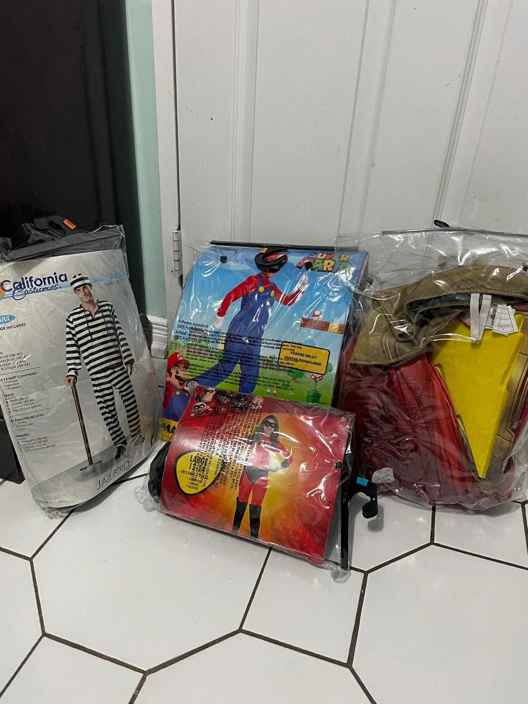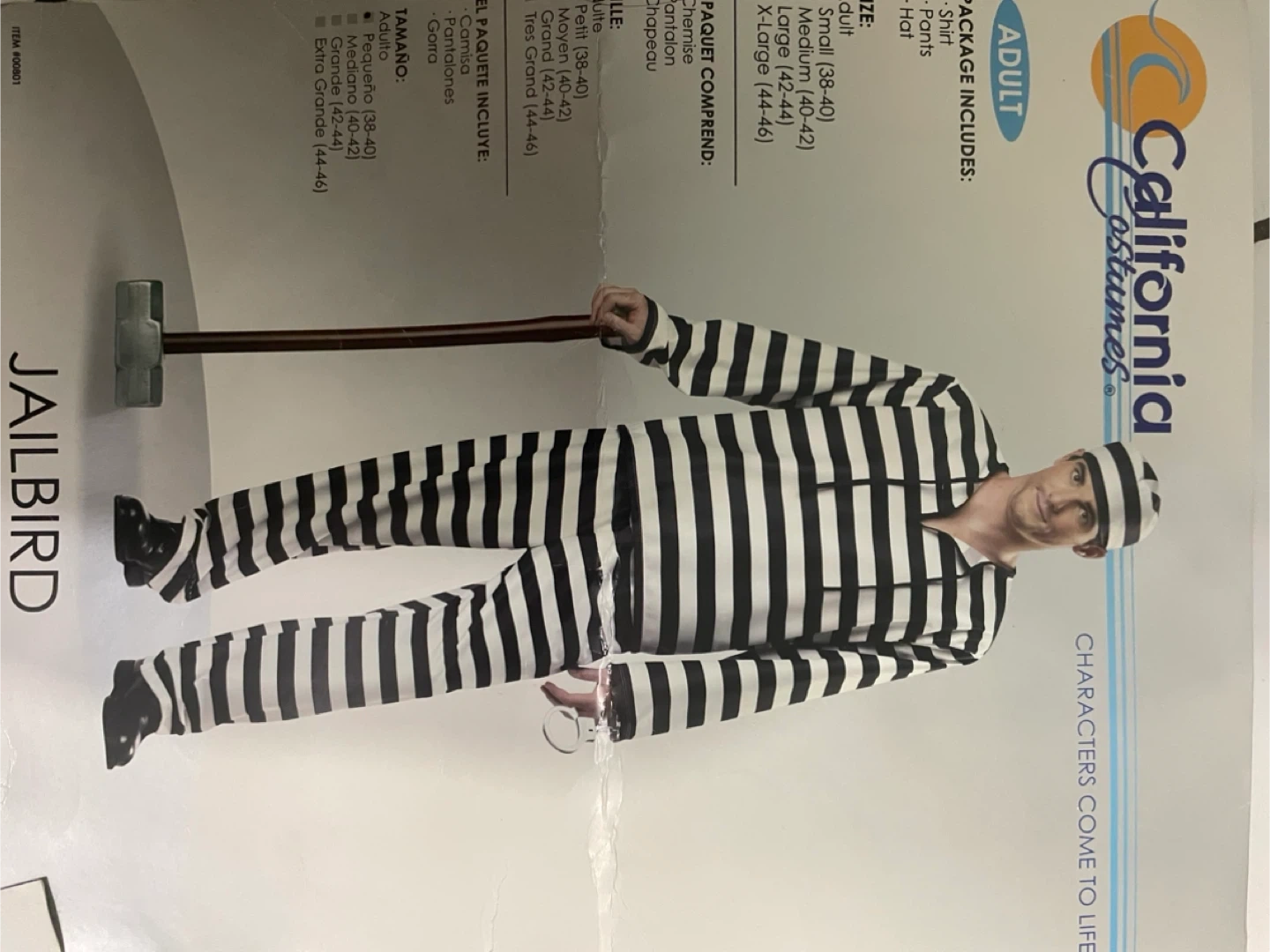 Selling a few kids' costumes: - California Costumes Jailbird costume. Includes shirt, pants, and hat. Size is Adult Small (38-40). - The Incredibles Violet costume. Includes jumpsuit, mask, and gloves. Size is Large (12-14). - Shazam costume
