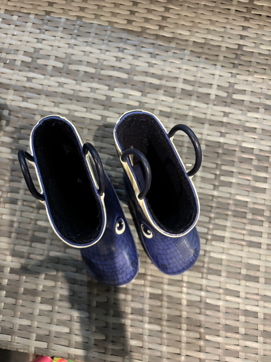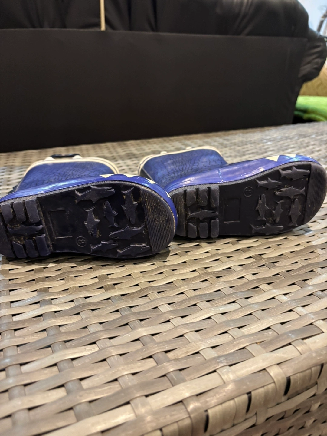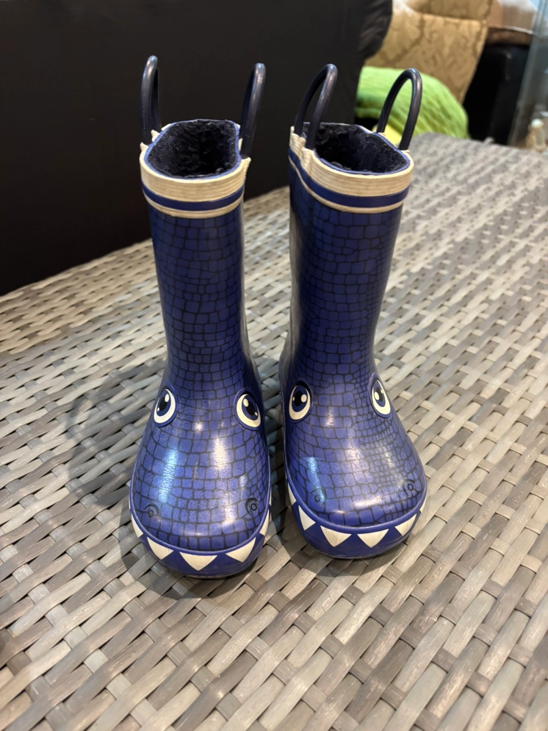 Adorable blue rain boots. Feature a dinosaur design. Small carry handles on each boot. Good for puddle jumping! Great for spring Smoke free pet free home Pick up can be Rathburn and the west mall area Or Symington and DuPont