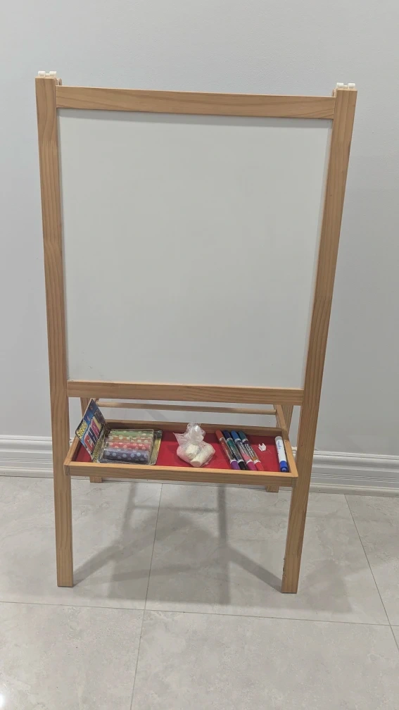 20Selling a kids' easel with both a whiteboard and a chalkboard! It's perfect for drawing, writing, and creative play. Includes a tray for holding markers, chalk, and other supplies