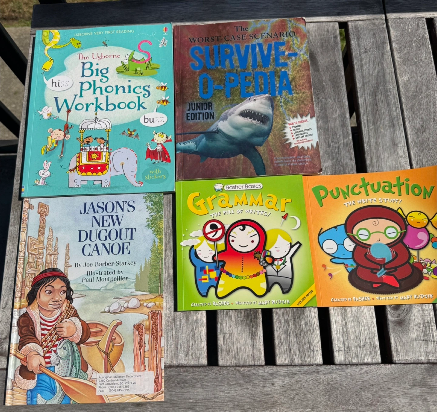 Selling a collection of educational books for kids! Includes: - The Usborne Big Phonics Workbook (with stickers!) - The Worst-Case Scenario Survive-O-Pedia Junior Edition - Jason's New Dugout Canoe by Joe Barber-Starkey - Basher Basics: Grammar - The Bill of Writes! - Punctuation - The Write Stuff! Great for early learning and fun reading.