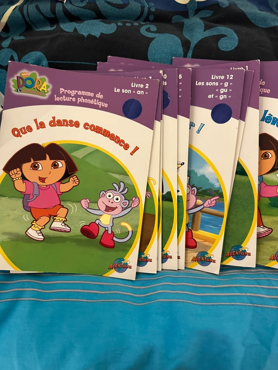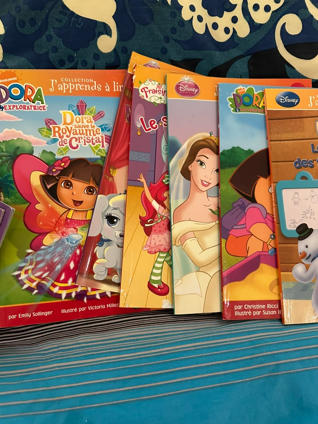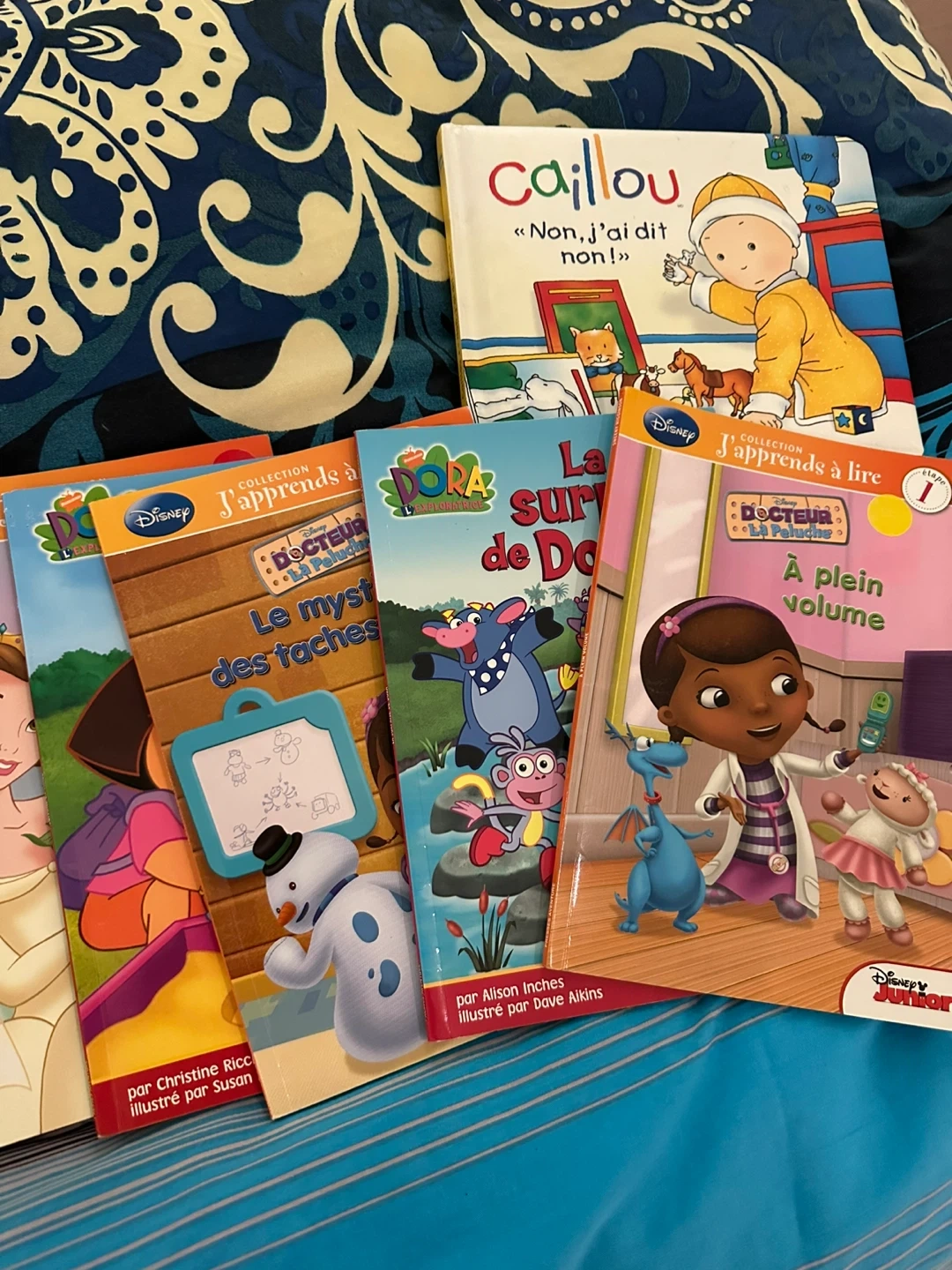 Selling a collection of kids' books in French! Includes Disney stories, Dora l'Exploratrice, Caillou, and Doc McStuffins books. 21 books in total Levels 1 and 2