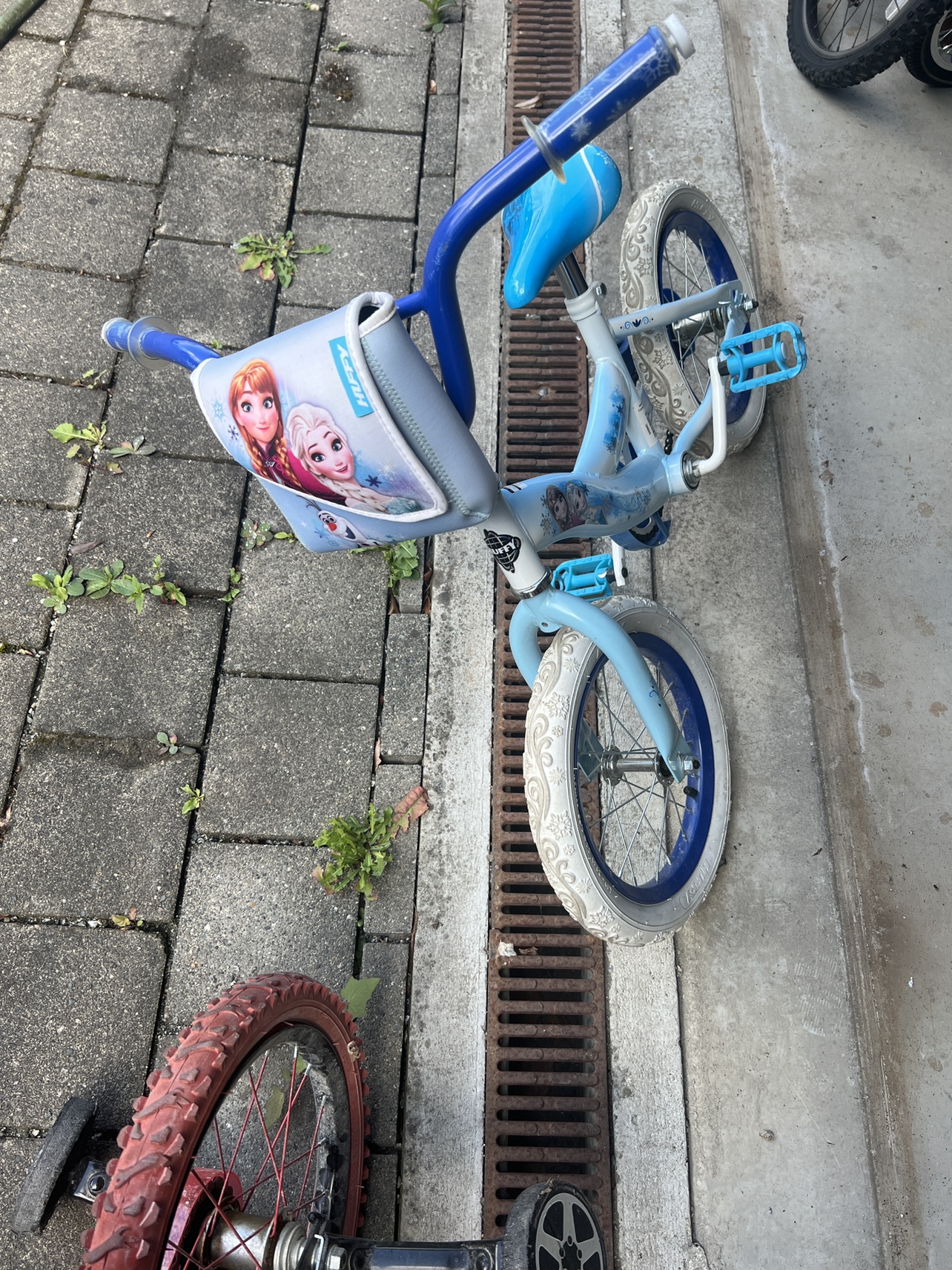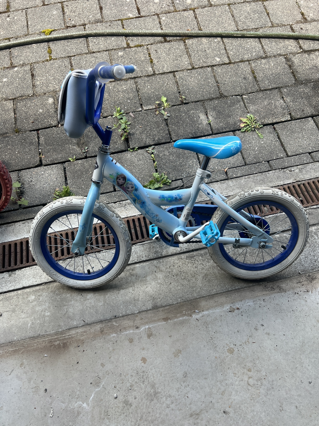 15• Design: Adorned with beloved Frozen characters, Elsa and Anna, making it a favorite among children. • Comfort: Ergonomically designed seat and handlebars ensure a comfortable ride. • Safety: Equipped with sturdy training wheels to help beginners learn to ride confidently. • Durability: High-quality materials and robust construction for long-lasting use. • Brand: Huffy • Model: Frozen Kids Bike • Size: Suitable for children aged 4-7 years • Color: Light Blue with Frozen-themed graphics