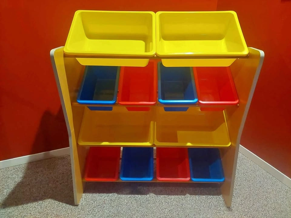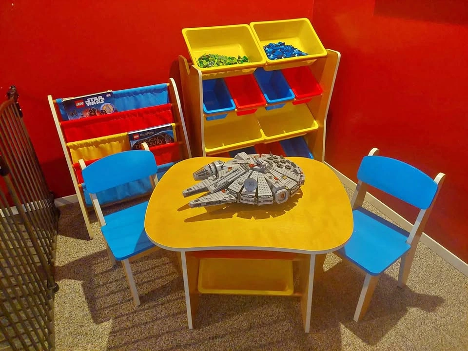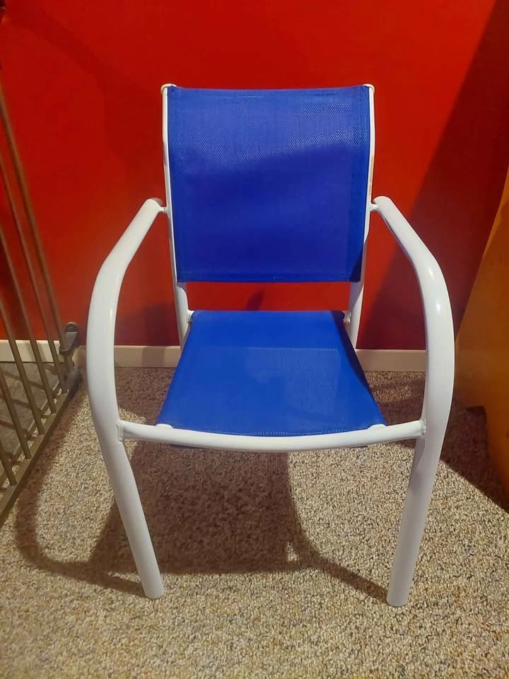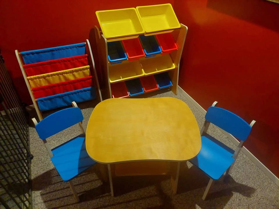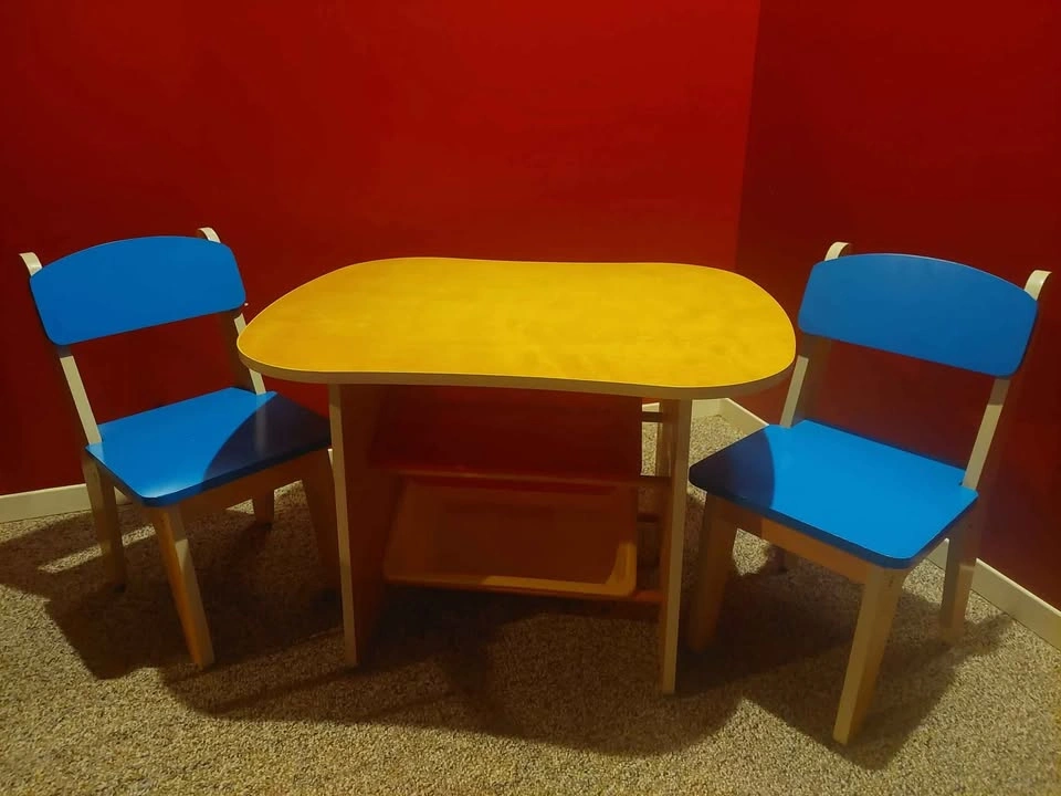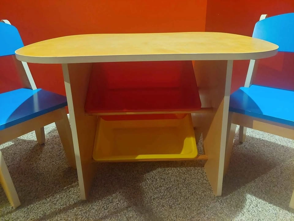 15Imaginarium kids’ furniture set in excellent condition. Includes: • Table with 2 large bins • 2 chairs (one has a minor chip – see photo) • Storage shelf with 4 large and 8 small bins • Book sling Clean, sturdy, and well cared for. Some minor scratches and wear. Smoke-free, dog-friendly home. Toys and books not included. Also have a blue & white Garden Treasures steel chair – great for outdoor use but only ever used indoors. Furniture set – $160 Blue & white steel chair – $25 Take all for $175 Pick up just outside Cambridge.