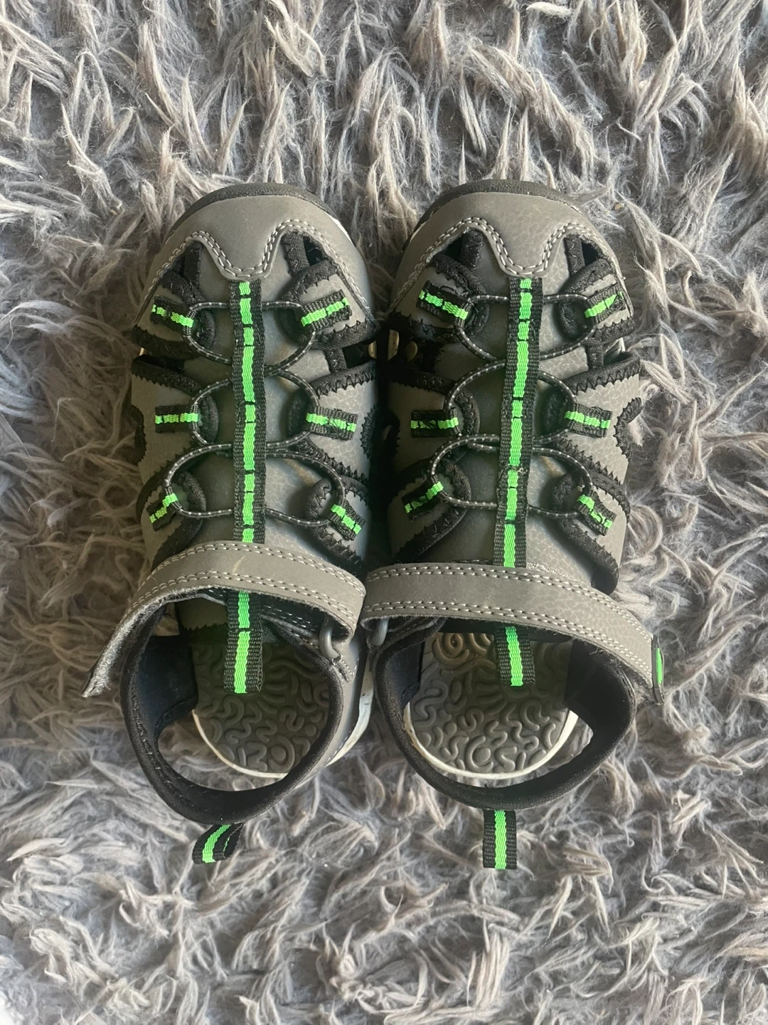 These cute kids' sandals are a size 1 and feature a stylish grey and black design with vibrant green accents. They have a closed-toe style with adjustable straps for a secure fit. Perfect for little adventurers!