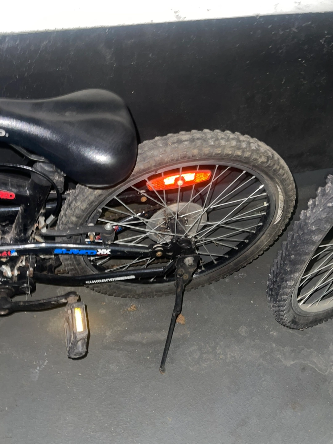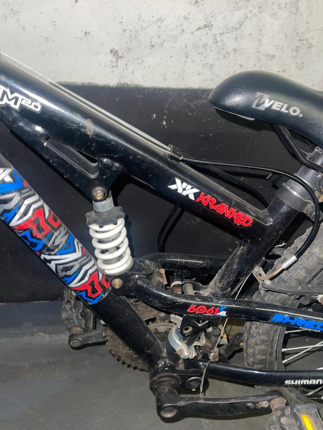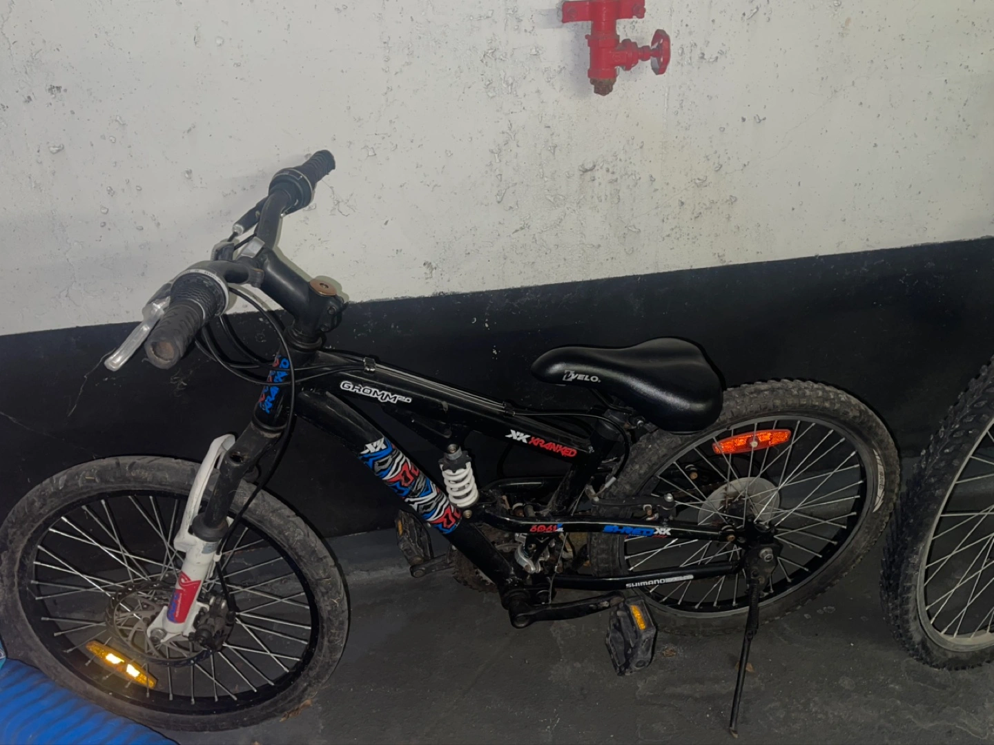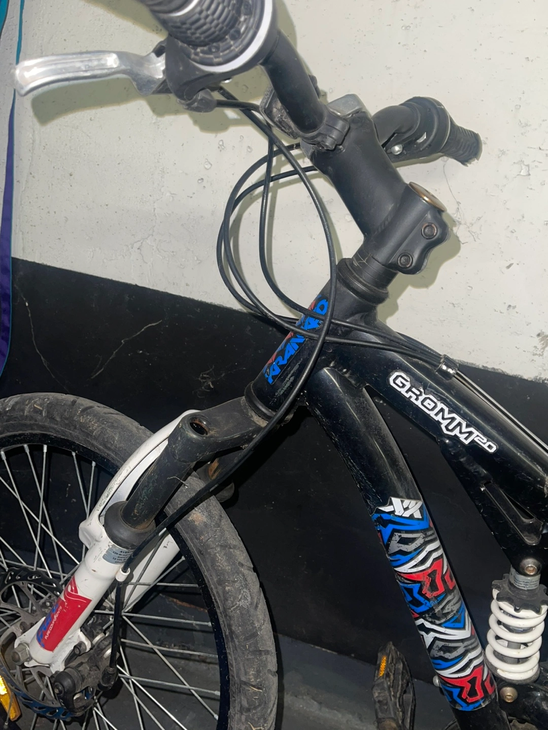 110Grom MX ranked bike. Black frame, blue and red accents. Features suspension forks and rear shocks. Includes Shimano components. Velo seat.
