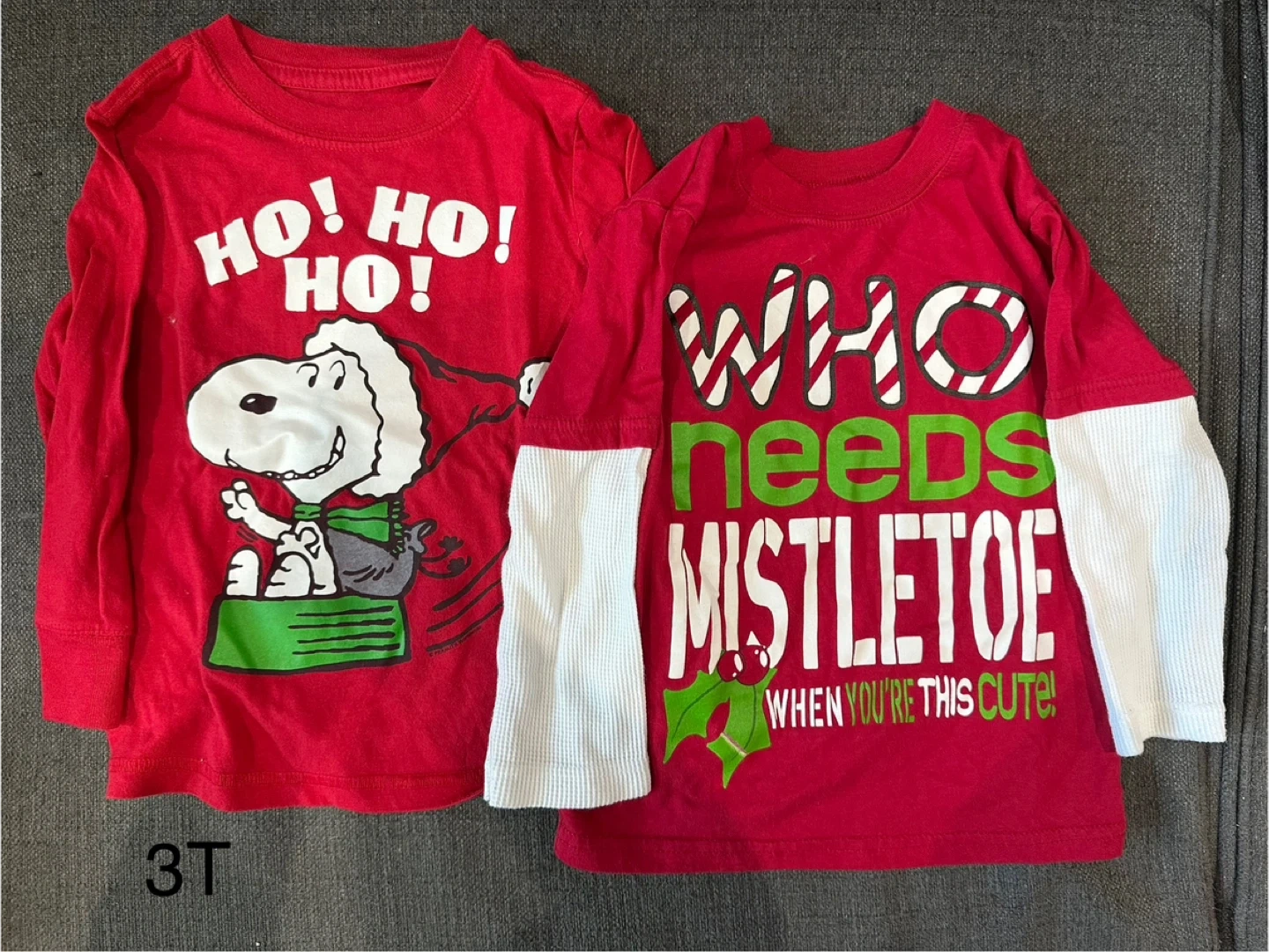 14Selling a bundle of holiday-themed clothes for kids in size 3T. Includes leggings with a festive pattern, a Snoopy long-sleeve shirt, and a "Dear Santa" t-shirt (label says size 2/4). Perfect for the holiday season!