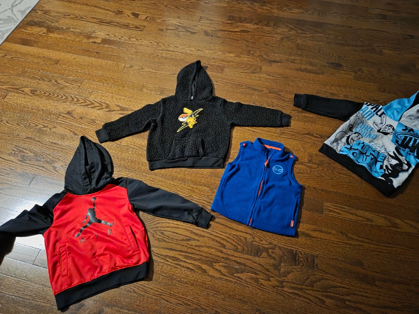 15Selling a bundle of gently used kids' hoodies and a vest. Includes a black Pikachu hoodie, a red and black Air Jordan hoodie, a blue vest, and a blue, black, and grey hoodie. All in good condition! size 5 and 6