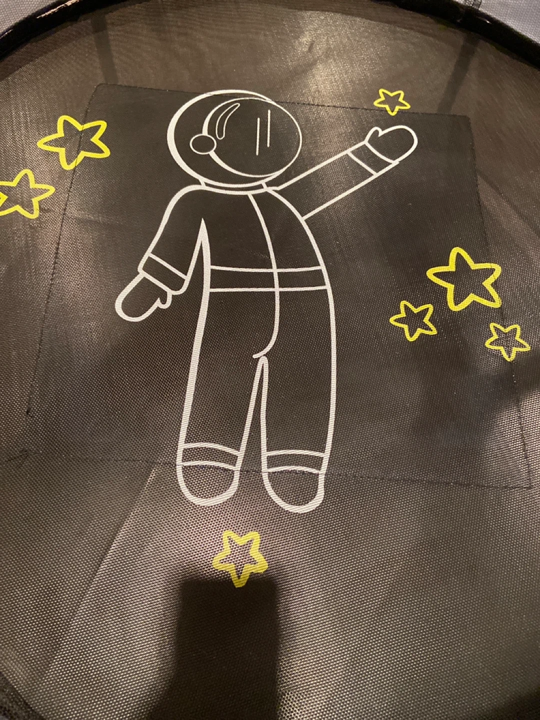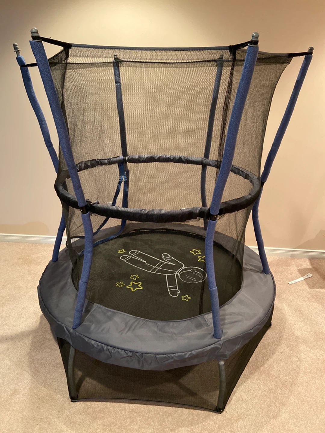 This trampoline is perfect for kids to burn off some energy, whether indoors or outdoors! It features a safety enclosure. The trampoline has a fun astronaut design and makes sound effects when jumping. Excellent condition.