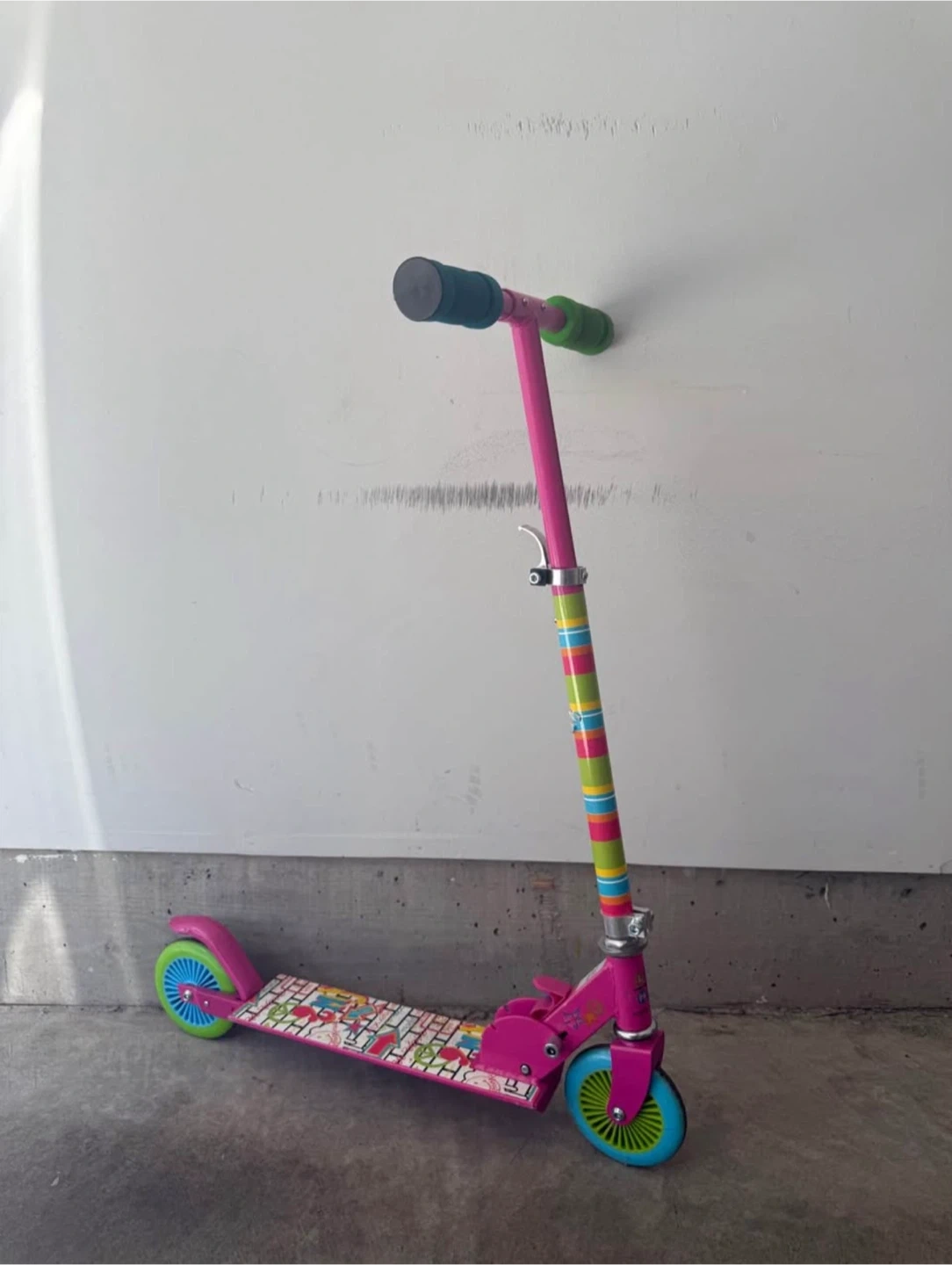Selling a cute pink scooter for kids! It has colourful stripes on the handle and a fun design on the footboard. Perfect for some outdoor fun! • Condition: Excellent – gently used, rolls smoothly • Color/Design: Pink with rainbow stripes and multi-colored wheels • Features: Adjustable handlebar, rear foot brake, foldable design for easy storage • Age Range: Best for kids approx. 5–10 years old A great way to keep kids active and having fun outdoors!