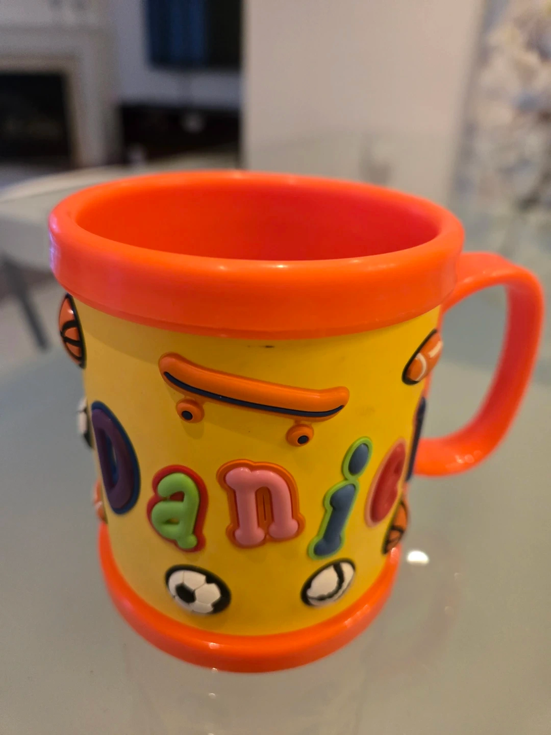 528A cute mug for kids! It's yellow and orange, and has little sports-themed decorations all around it. It says "Daniel" on the side.