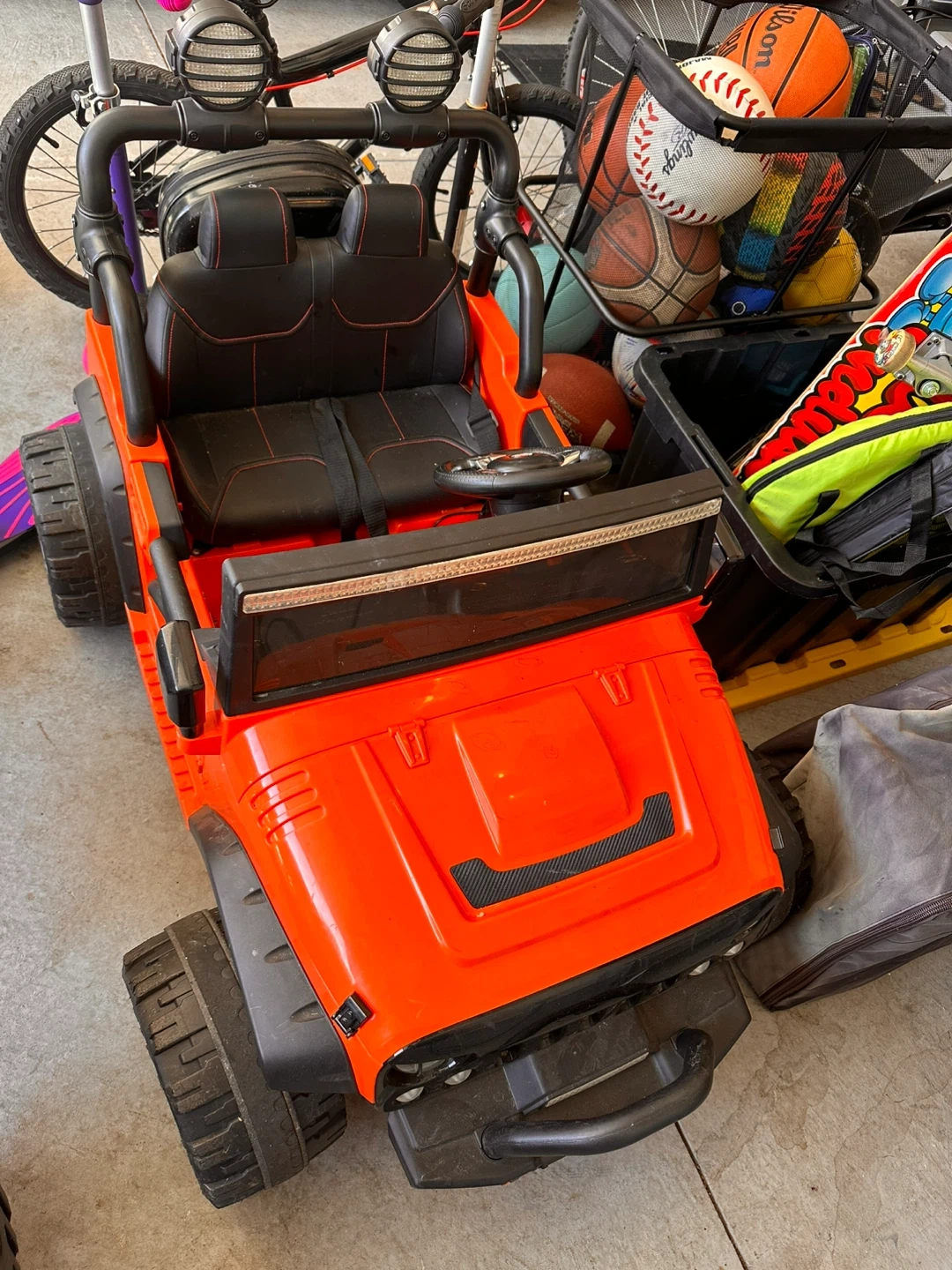 Selling a gently used orange ride-on jeep for kids! It features a black interior with two seats. Perfect for outdoor adventures and imaginative play. It has some signs of use but is still in good working condition and ready for a new home!