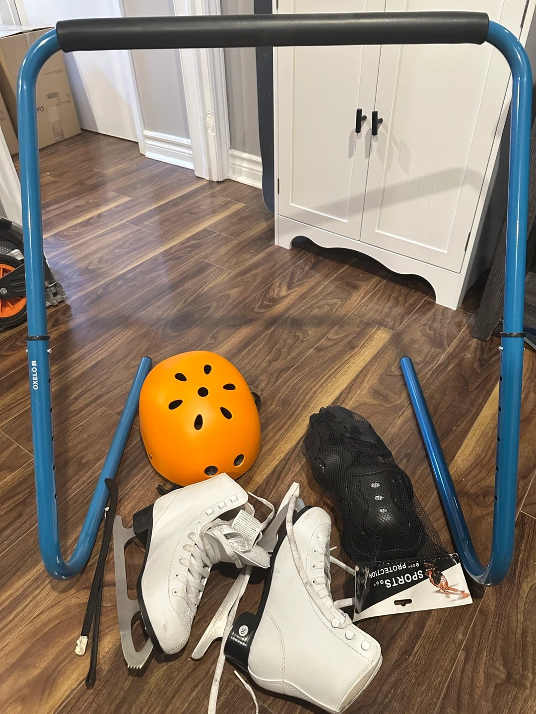 Selling a complete kids' ice skating set! Includes white ice skates , an orange helmet, knee and elbow pads, and a blue Oxelo skating trainer. Everything your little one needs to get started on the ice!