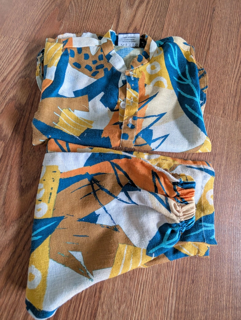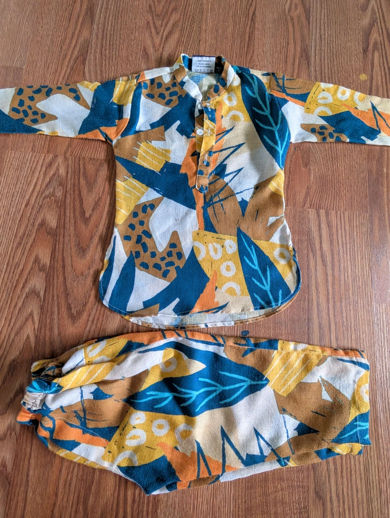 A cute patterned shirt and pants set for kids! The set features a colourful and unique design. Perfect for playdates or casual outings!