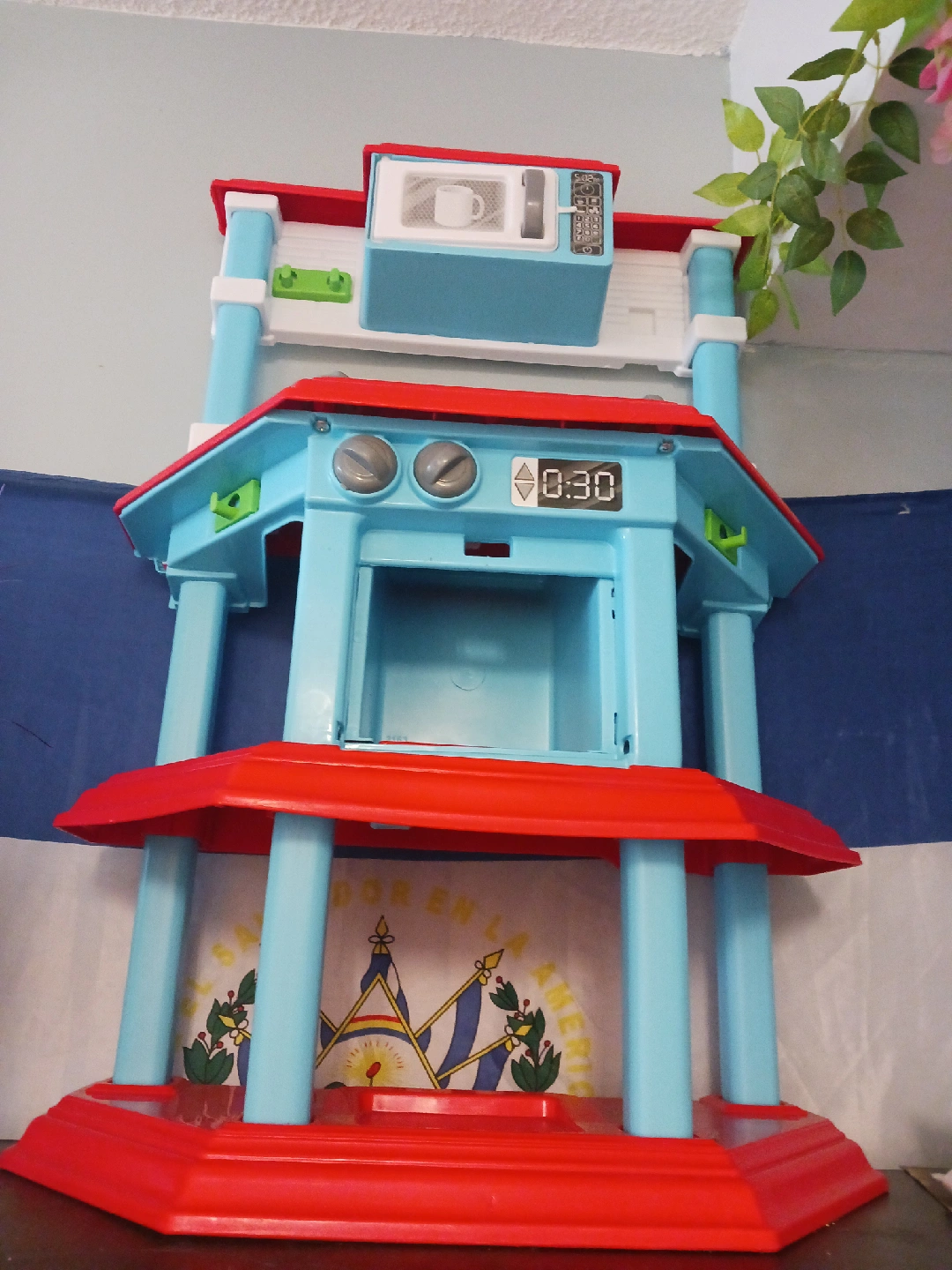 1000+Selling a cute kids' play kitchen in blue and red! It features a microwave and oven for hours of imaginative fun. Perfect for little chefs!