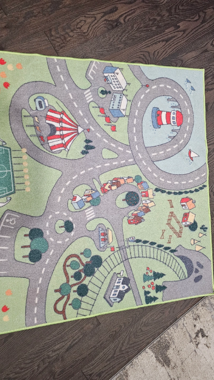 This play mat rug is perfect for kids! It features a fun road and city design that will keep them entertained for hours. The rug is in great condition.