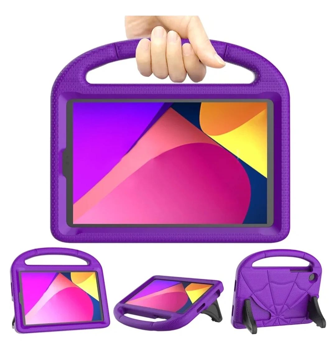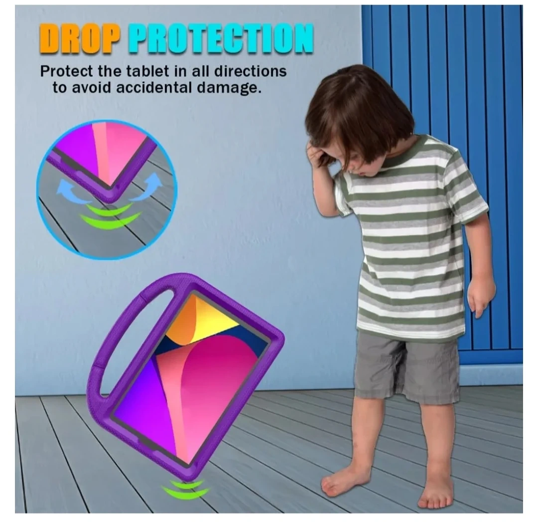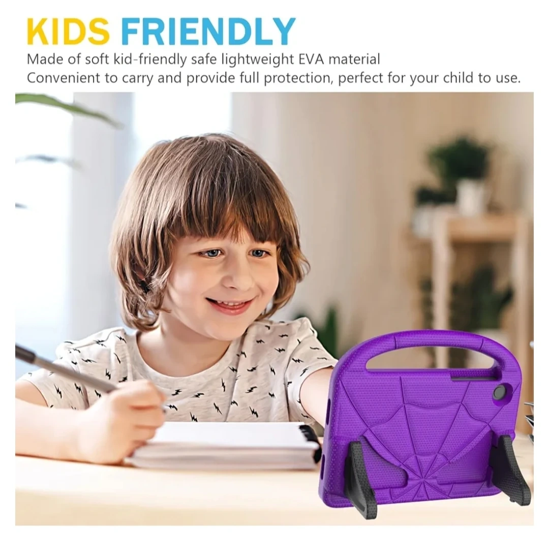 Durable, lightweight EVA material. Child-friendly design. Built-in stand with two viewing angles. Full access to tablet features. Drop protection. Convenient carrying handle.