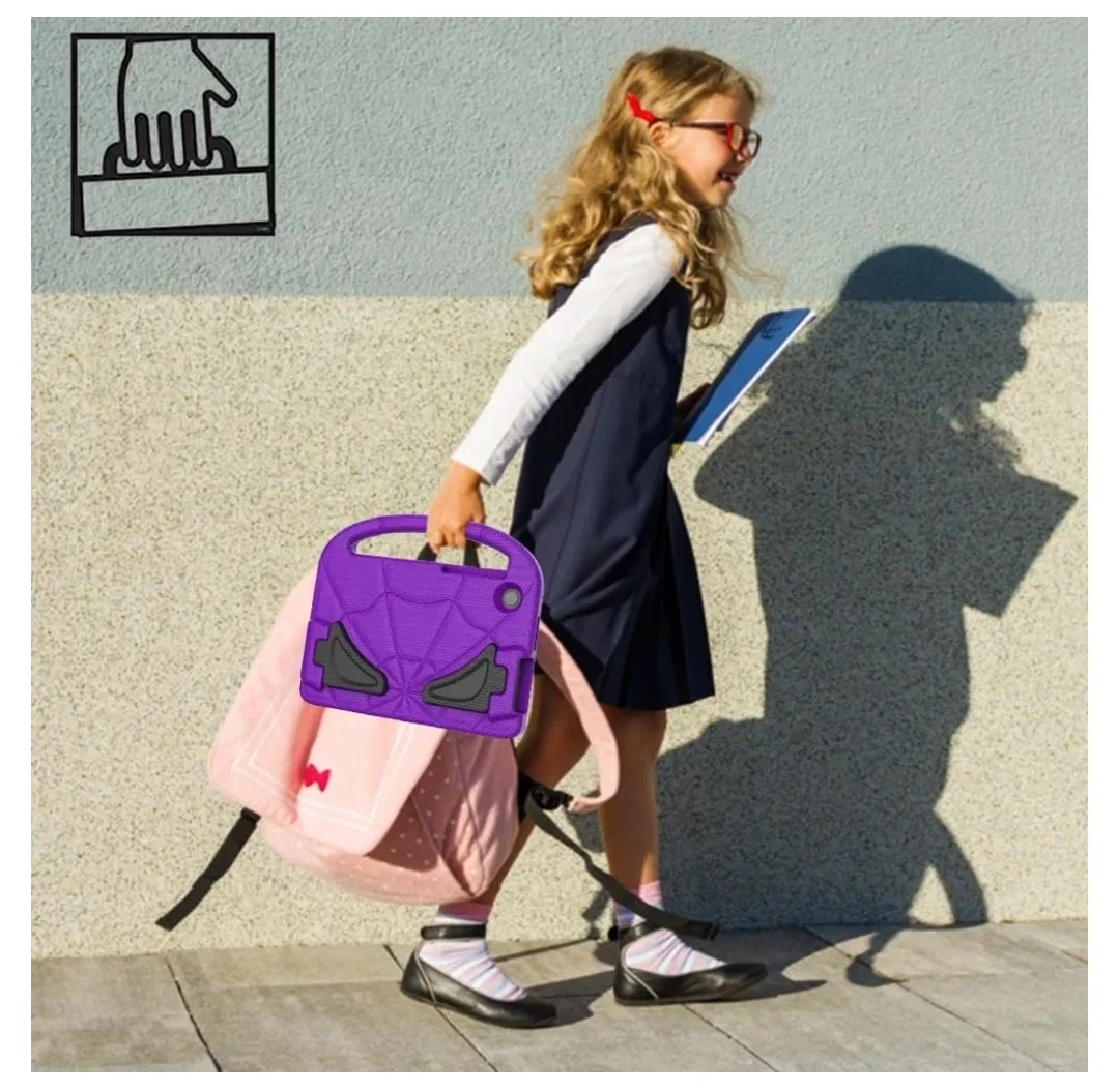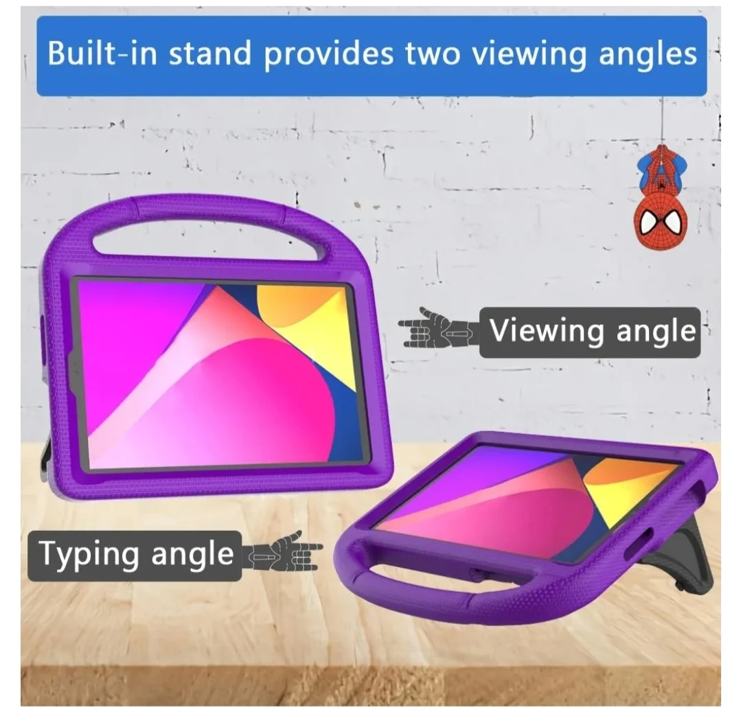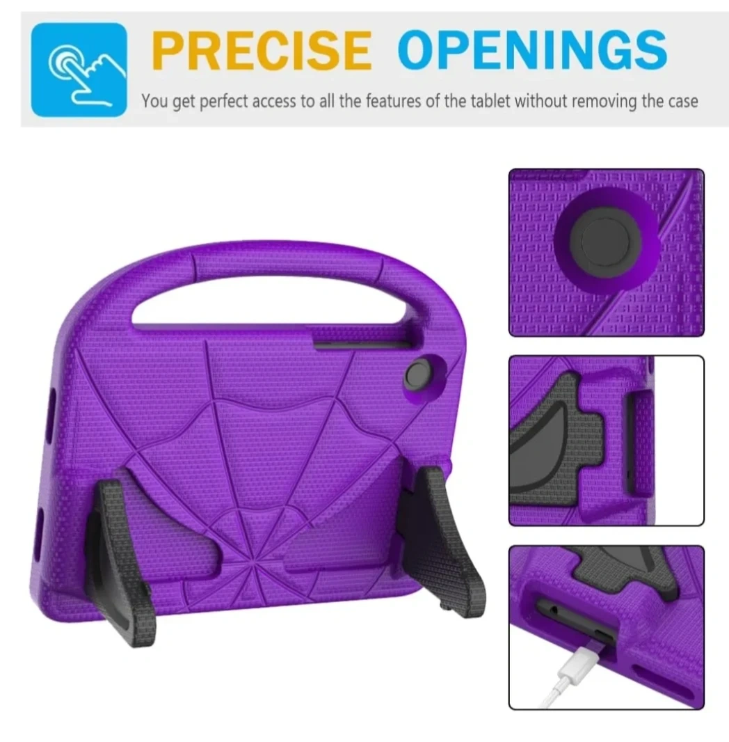 Durable, lightweight EVA material. Child-friendly design. Built-in stand with two viewing angles. Full access to tablet features. Drop protection. Convenient carrying handle.
