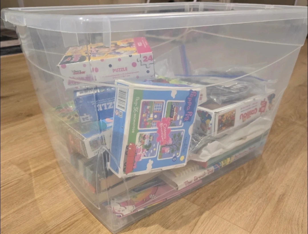 10Selling a bin full of kids puzzles and books! Includes puzzles featuring Peppa Pig, Disney characters, and Caillou. Great for keeping the little ones entertained!