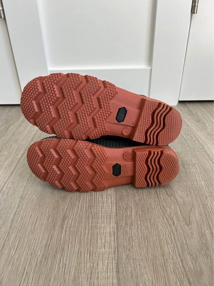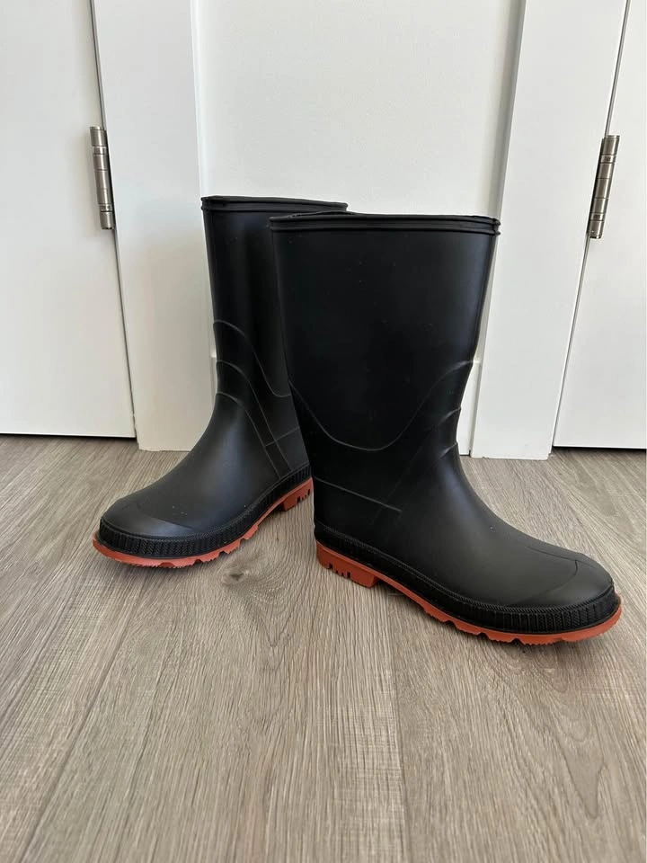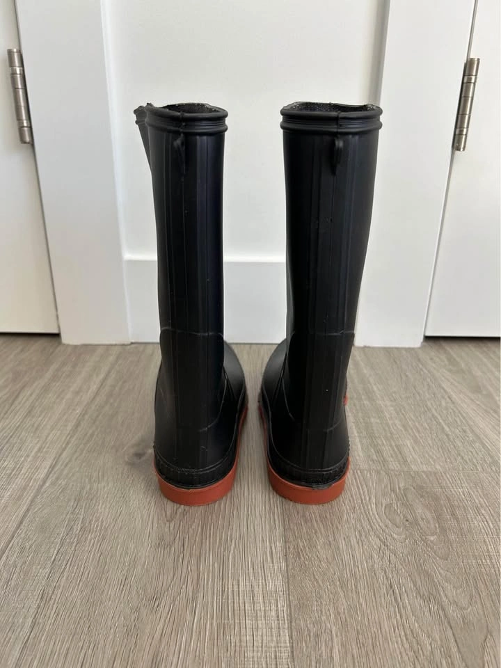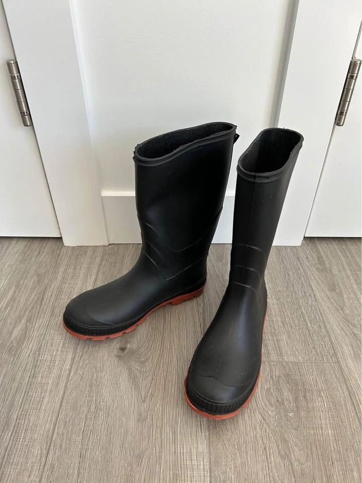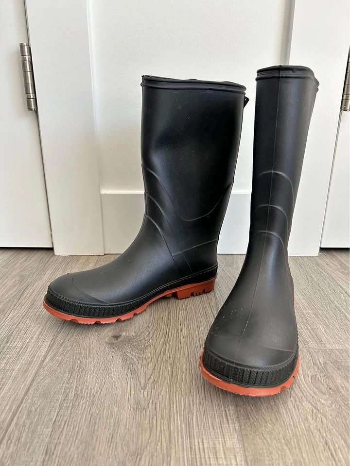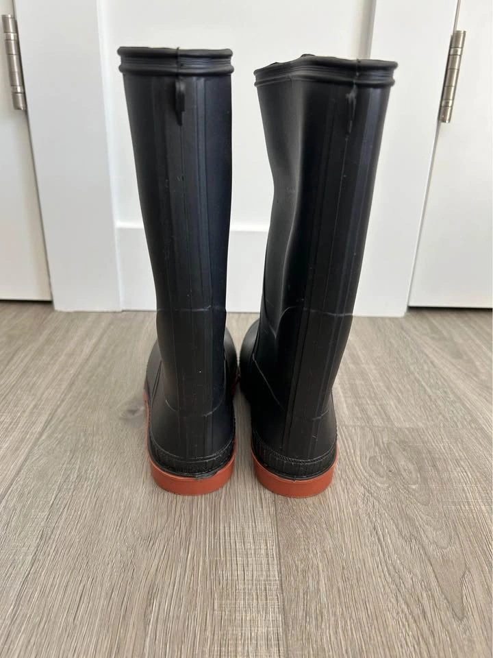 Rain Boots, Rubber, Waterproof Black size:US:5 Unisex Excellent Conditions (used tew times) These boots provide 100% waterproof protection. The 14" (35.5 cm) height ensures ample coverage.