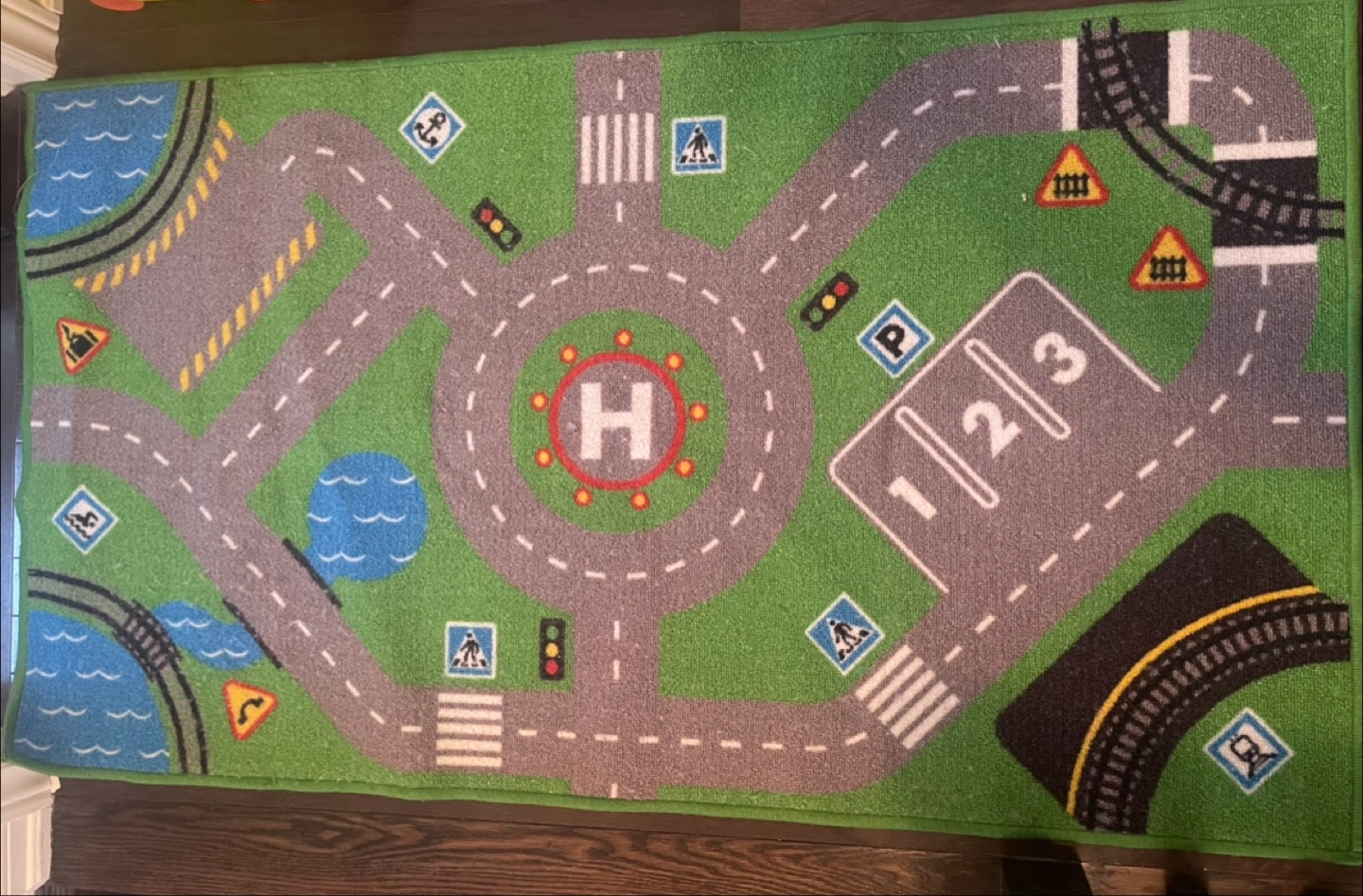 This is a fun road traffic play mat rug for kids! It features a colourful design with roads, parking spots, and other traffic elements for imaginative play. Good condition from ikea!