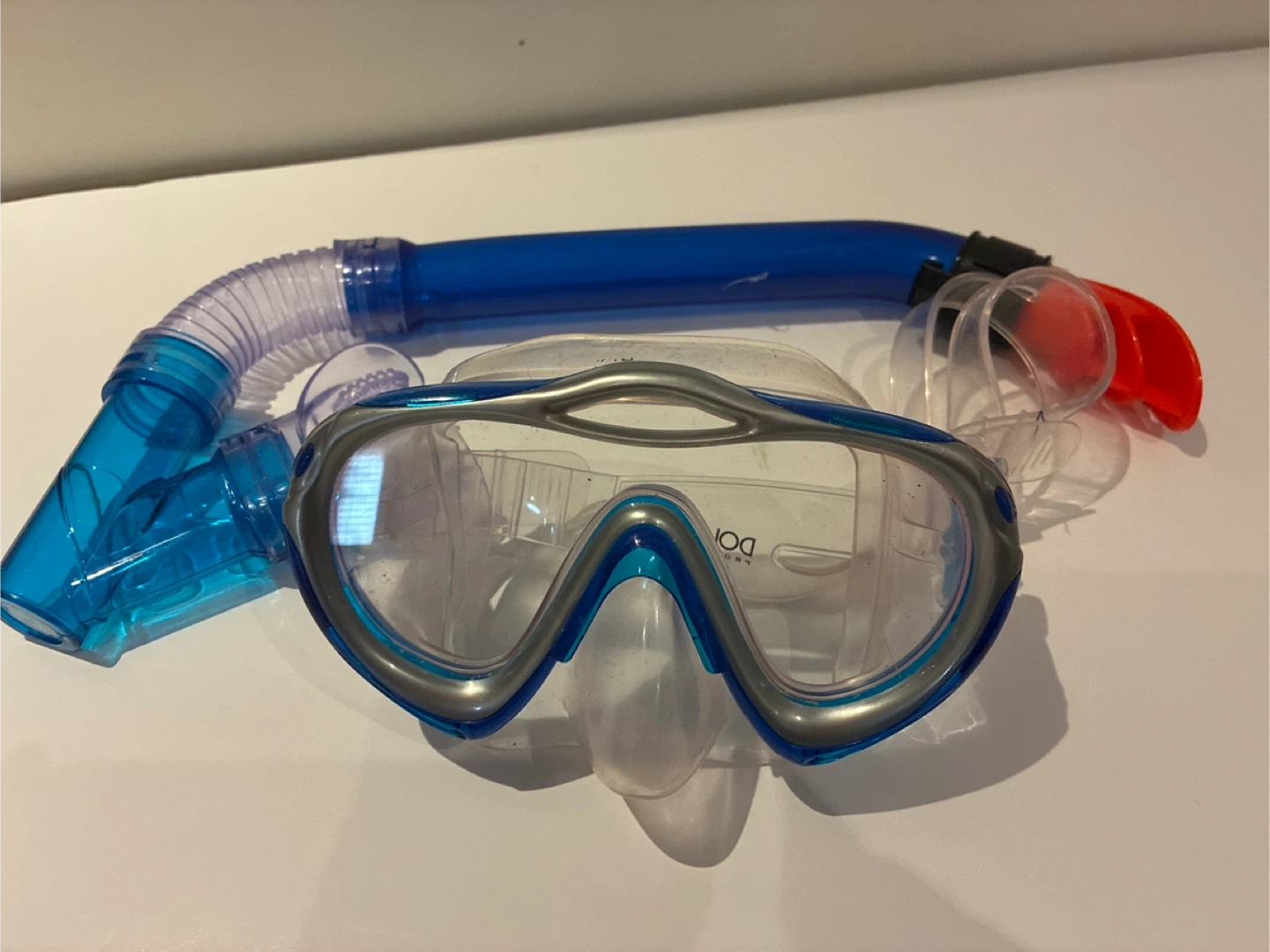 202Selling a snorkel mask set, perfect for your next underwater adventure! The set includes a mask with a blue and silver frame, and a blue snorkel with a red mouthpiece. Ready for some fun in the water