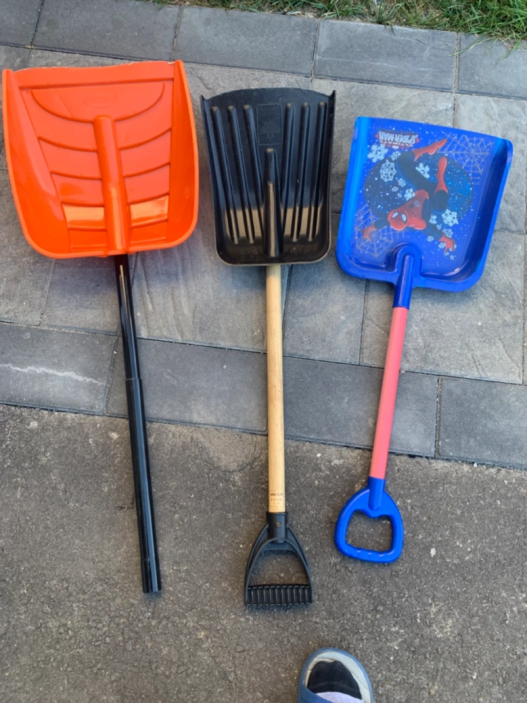 Three snow shovels for kids, ready for winter fun! - One orange plastic shovel with a black handle - One black plastic shovel with a wooden handle and a unique grip - One blue plastic Spiderman-themed shovel with a pink handle