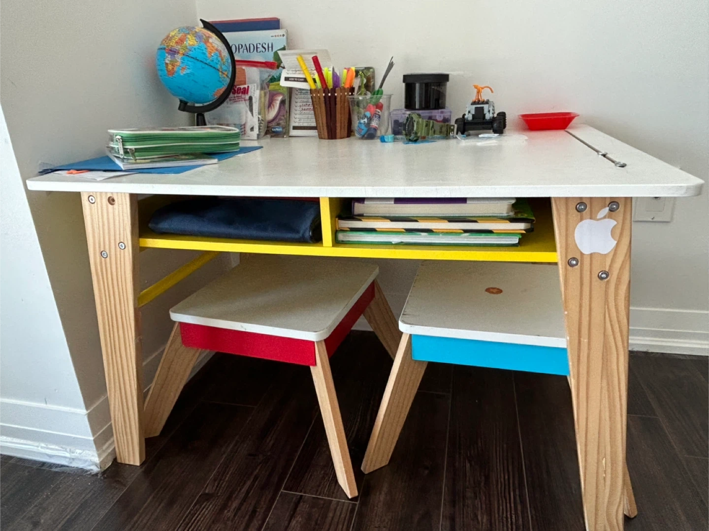 Looking to sell kids study table of age 4-8 years. It's in good condition and perfect for a kid's room or play area. The set includes a desk with a white top and natural wood legs, along with two stools featuring red and blue accents. Great for homework, arts and crafts, or playtime!