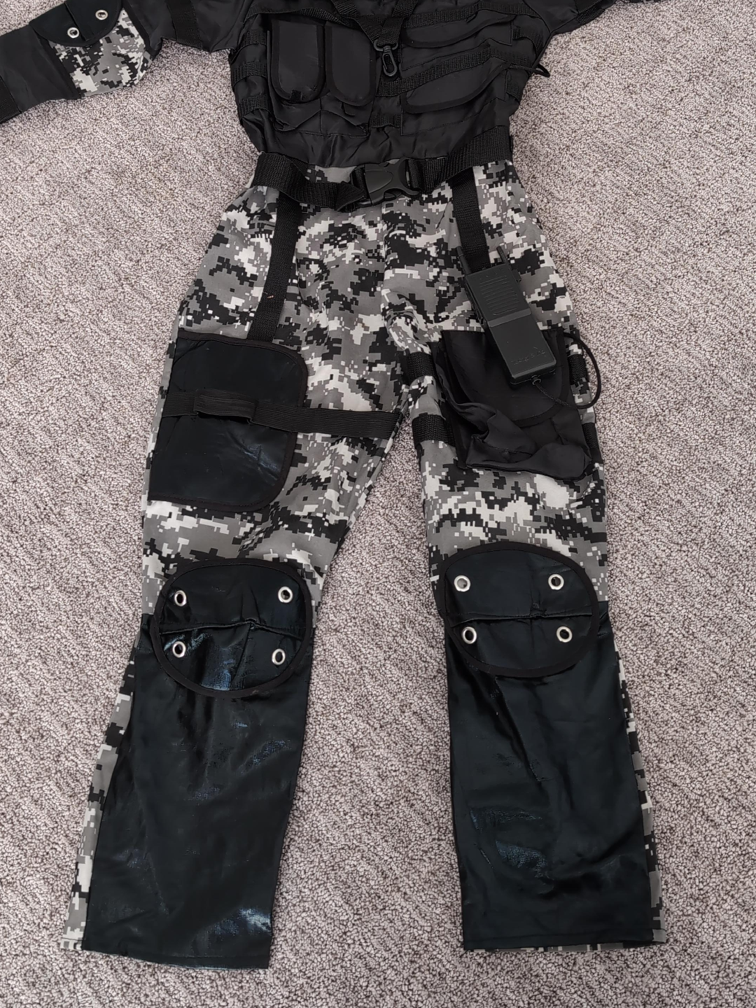 5Selling a gently used kids SWAT costume. It features a black tactical vest, grey and black camouflage pants, and some accessories to complete the look. Perfect for dress-up or Halloween!