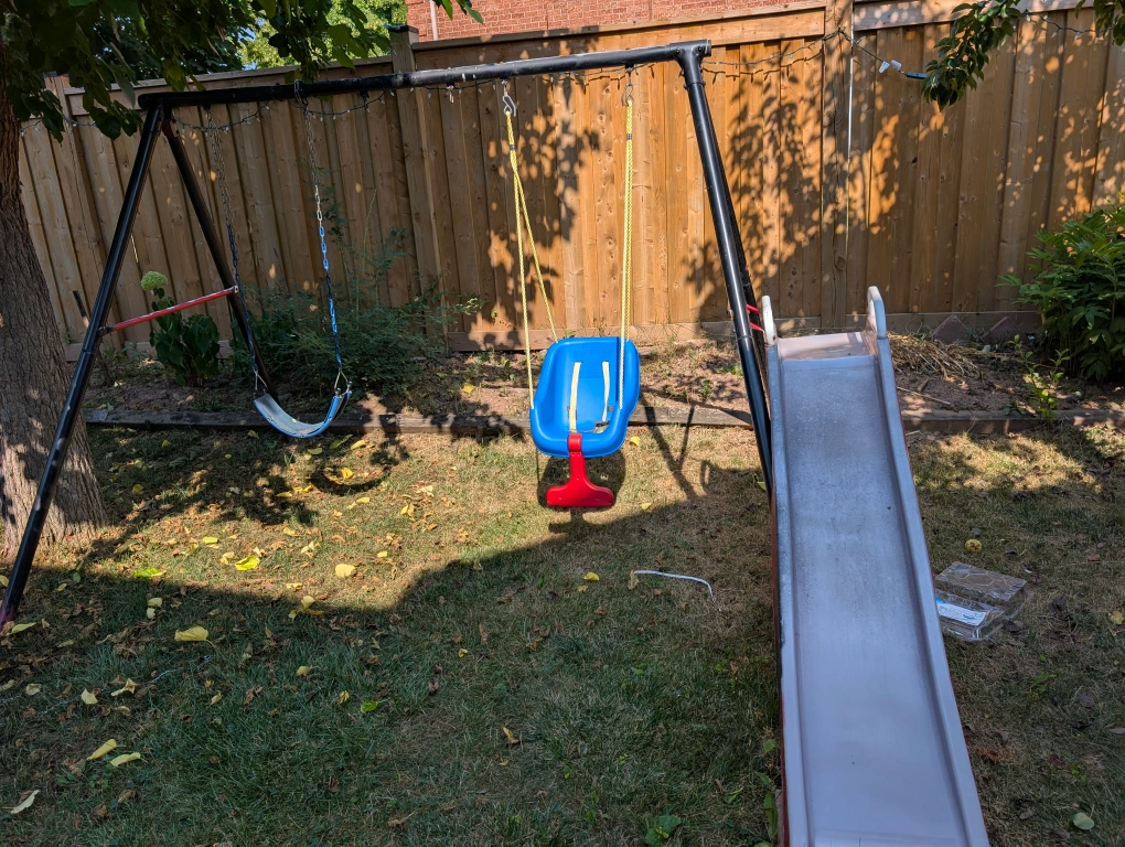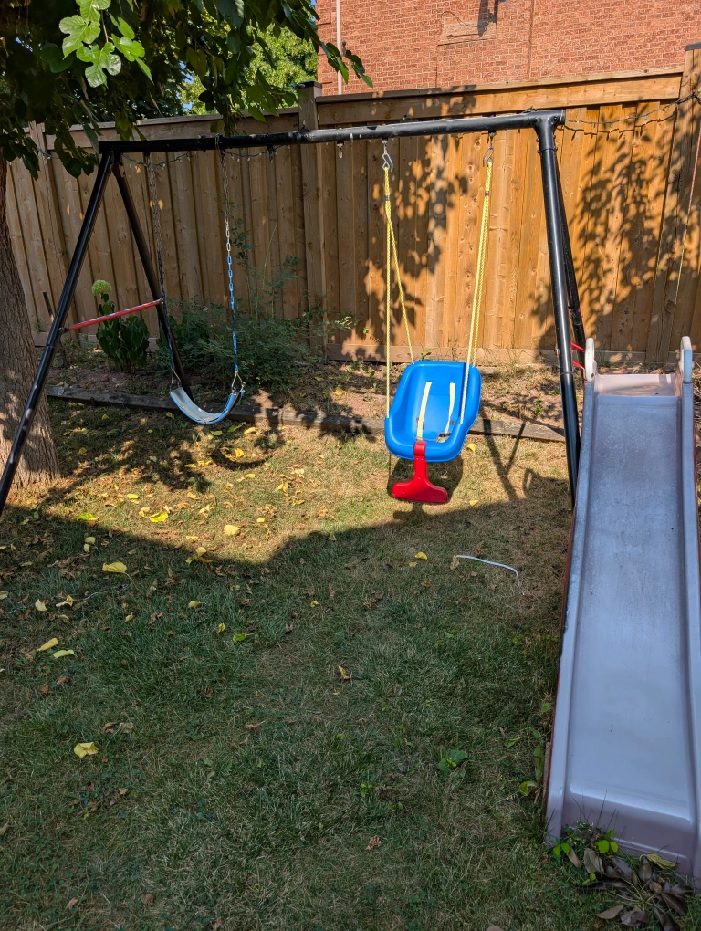 Selling a gently used kids' swing set with a slide. It includes two swings and a slide, perfect for backyard fun for the little ones! The set is in good condition and ready for a new home. It's a great way to keep the kids active and entertained outdoors