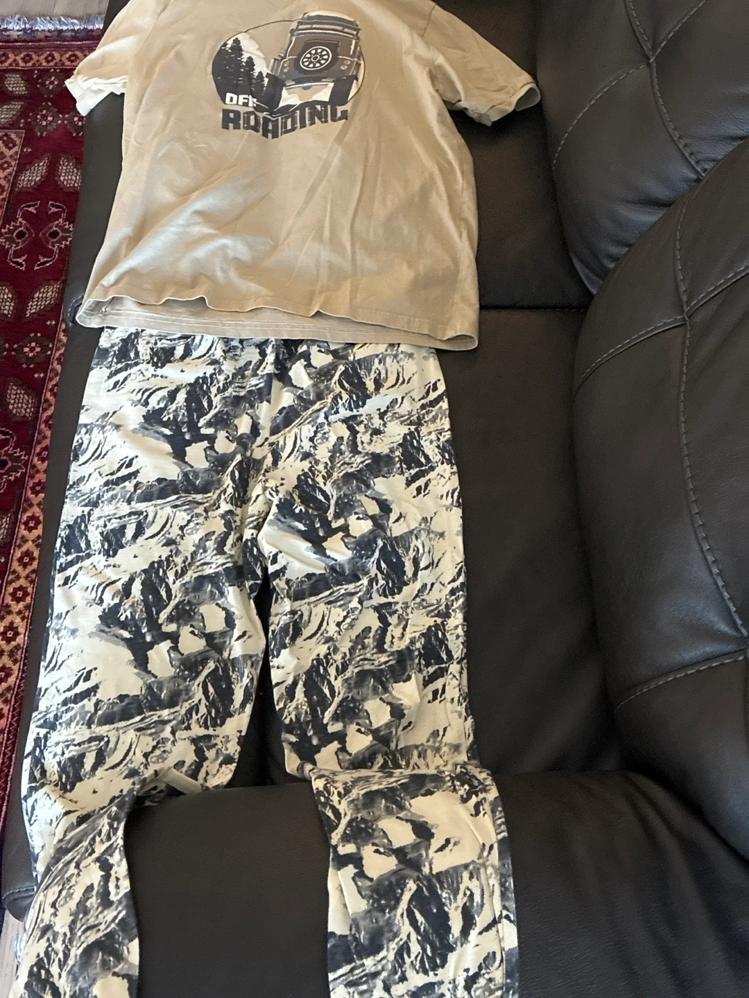 15A cute set for kids including a t-shirt with an 'Off Roading' design and pants with a mountain-like pattern