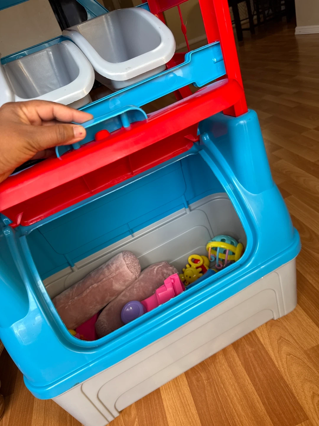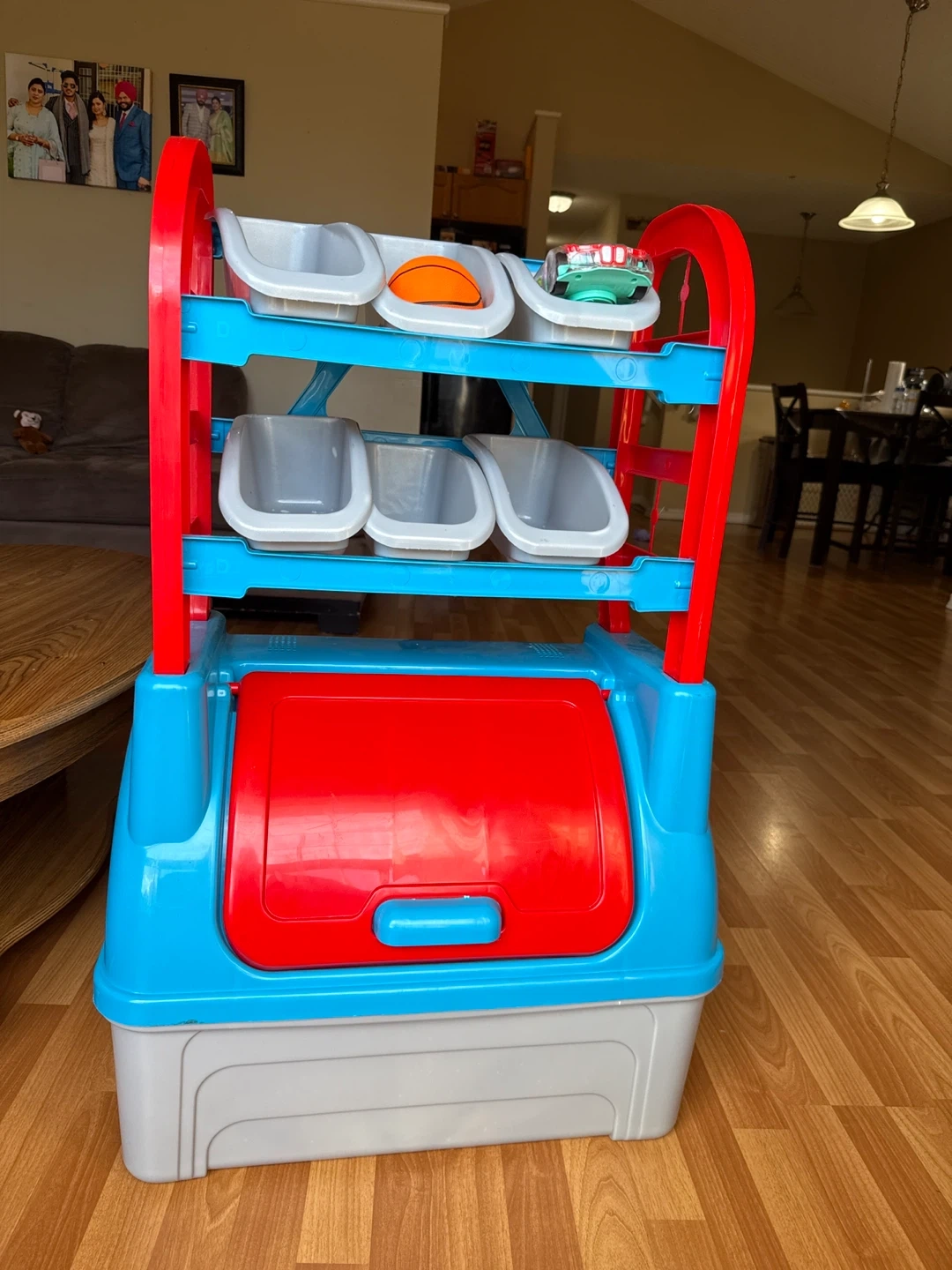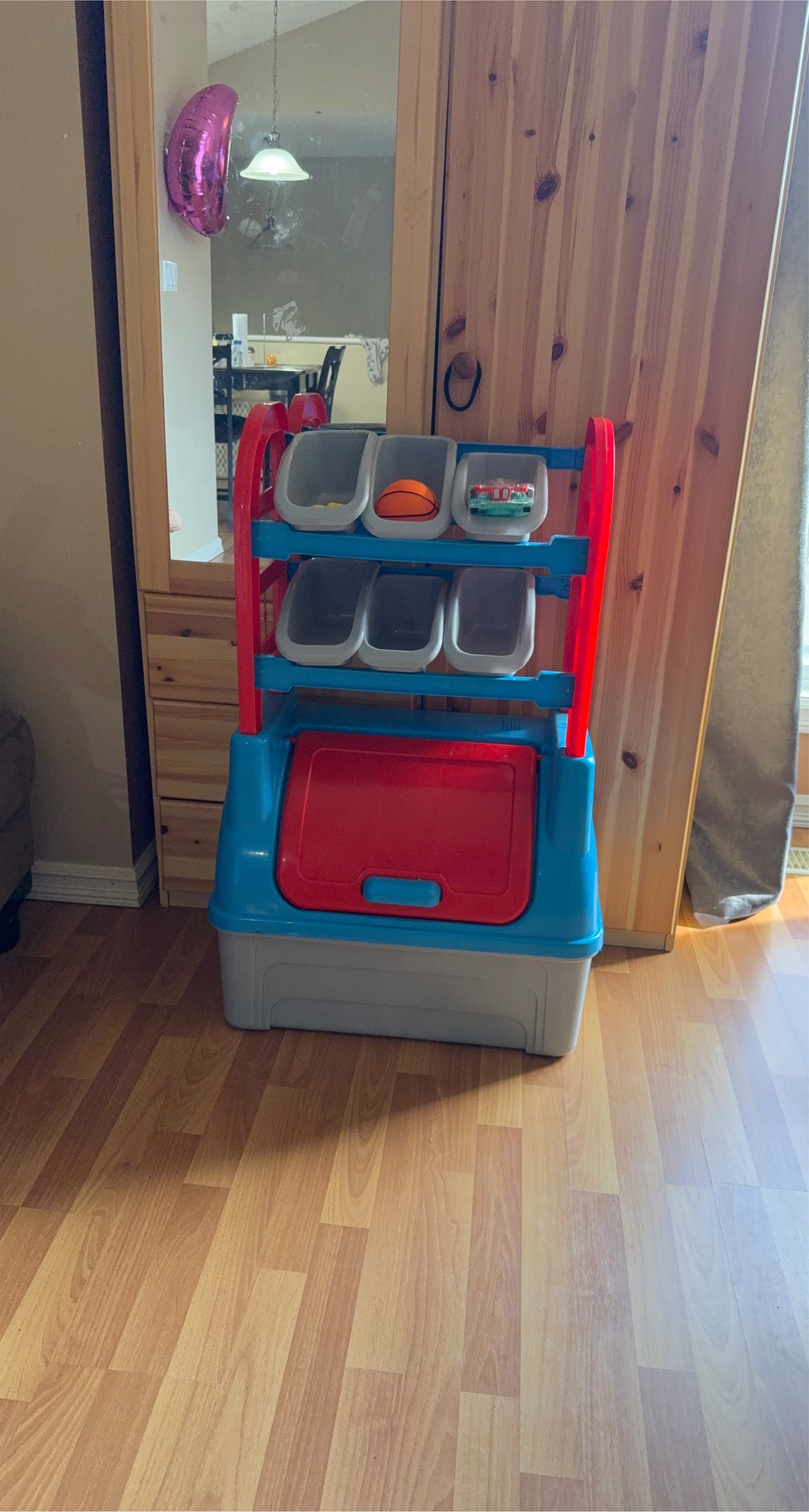 This toy storage organizer is perfect for keeping your little one's play area tidy! It features multiple bins and a large storage compartment at the bottom, offering plenty of space for toys, books, and other essentials. The bright colours will add a fun touch to any room