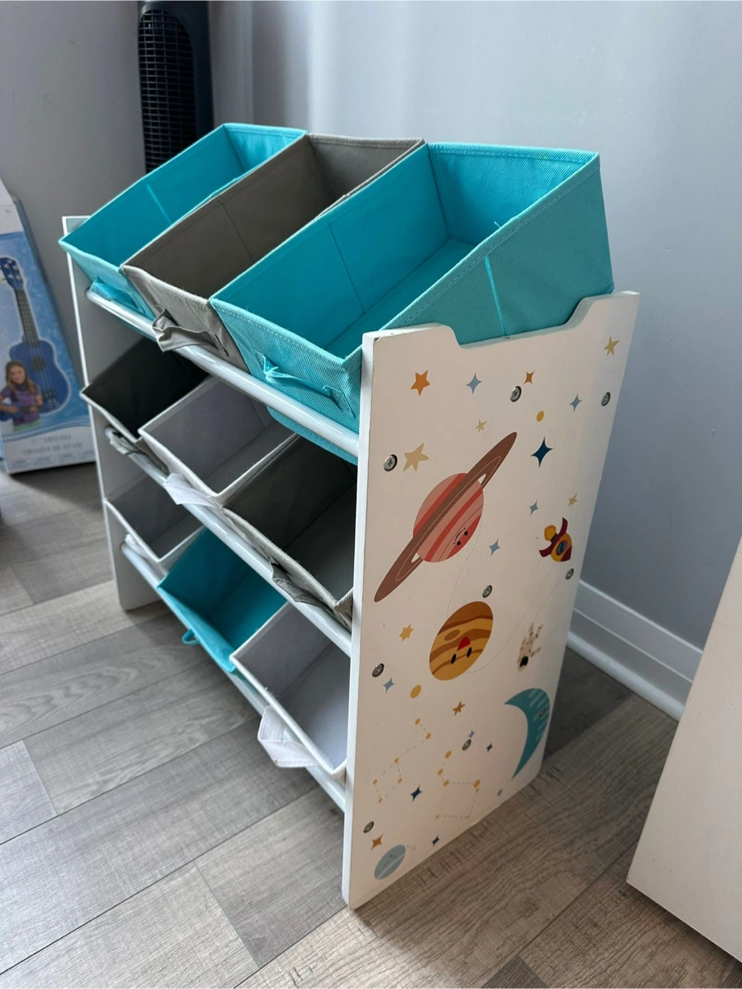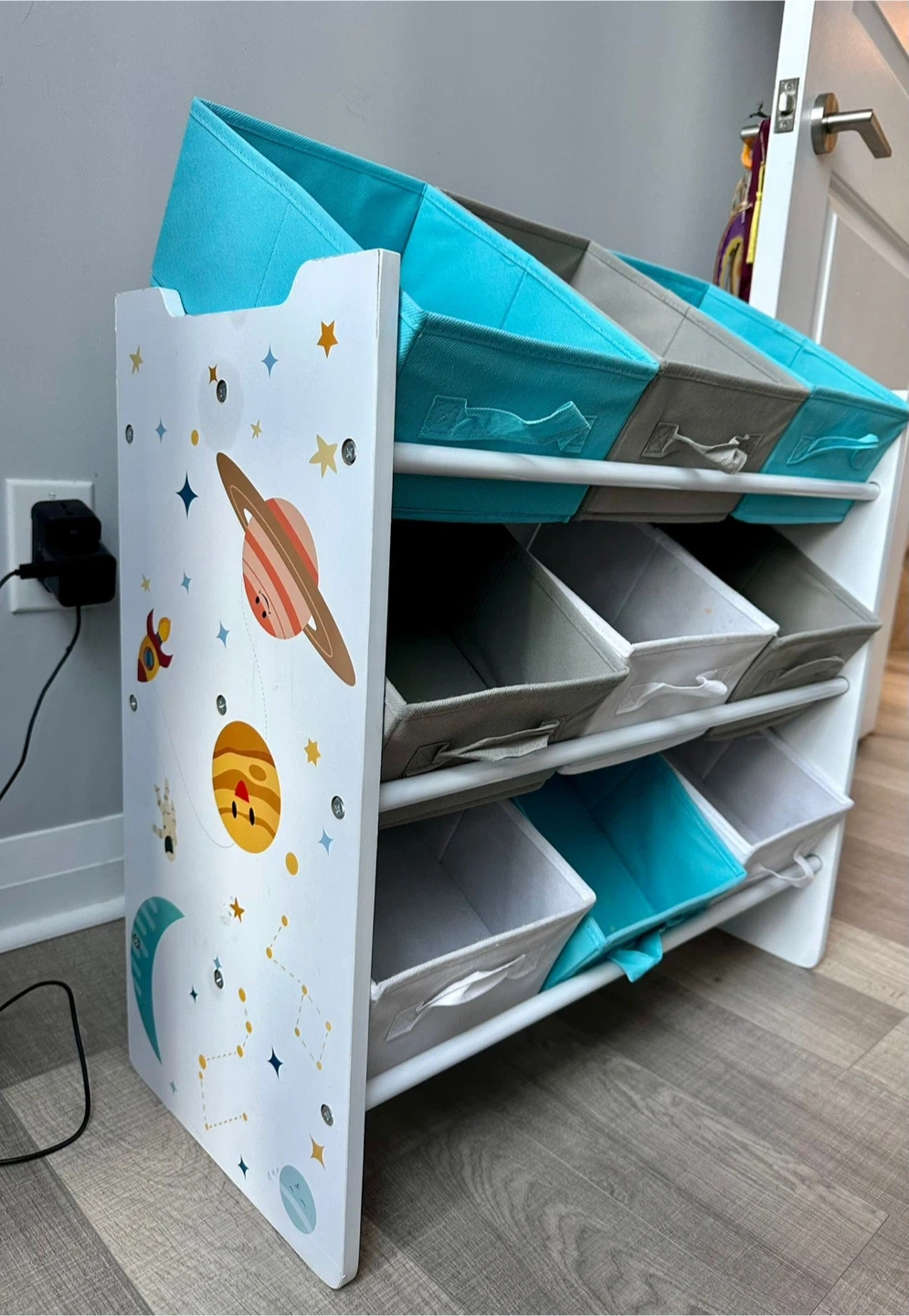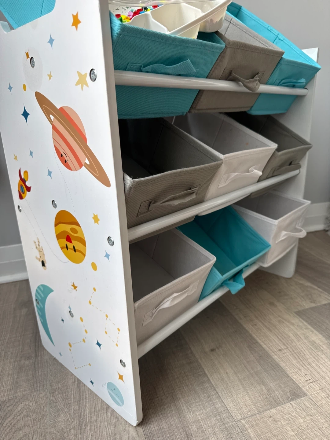 Declutter your little one's space with this adorable toy storage organizer! It features multiple bins in cute colours like teal, grey, and white. The sides are decorated with a fun space theme, including planets, stars, and a rocket ship. Perfect for keeping toys, books, and art supplies neatly organized