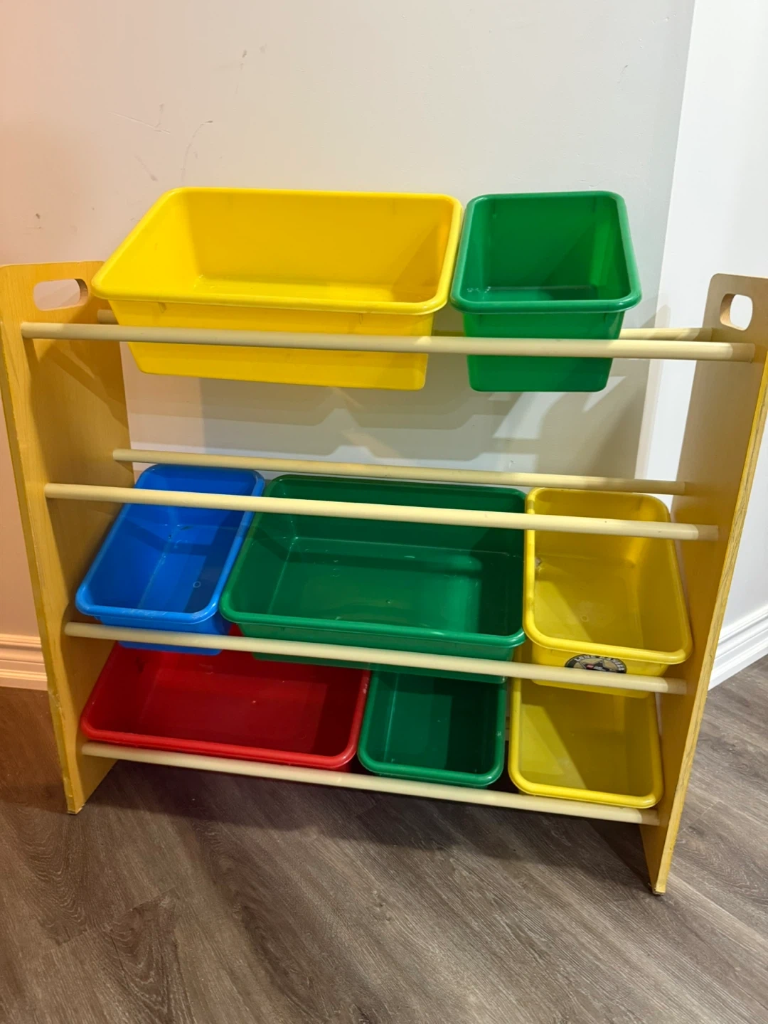 240Declutter your little one's play area with this handy toy storage organizer! It features a sturdy frame and colourful bins in yellow, green, blue, and red. Perfect for keeping toys, books, and art supplies neatly organized and easily accessible