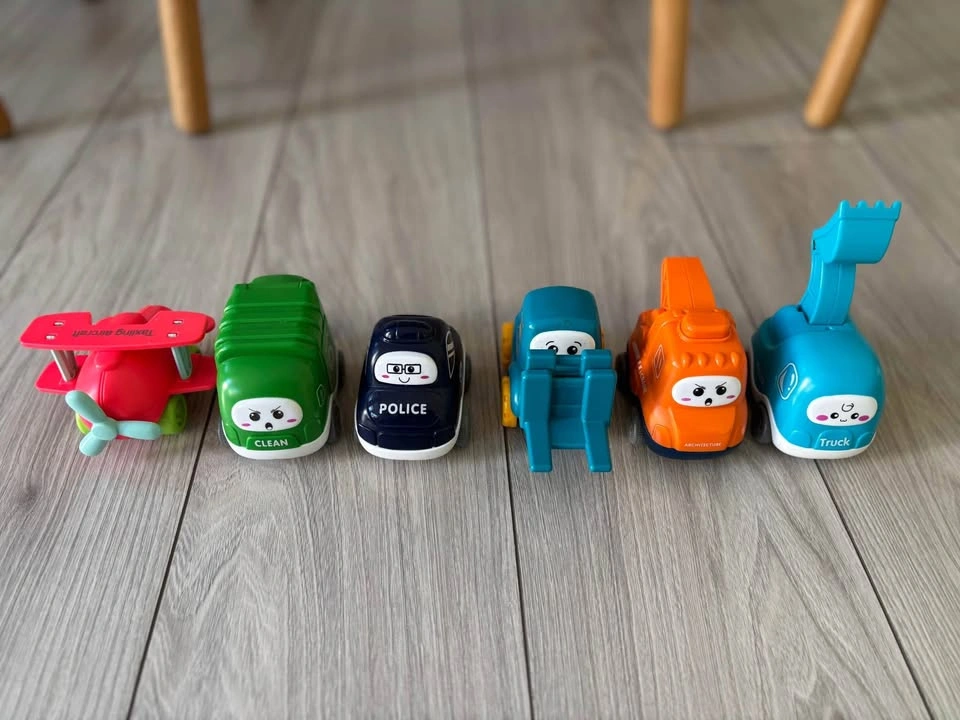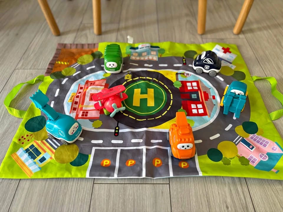 0Colorful kids toy vehicles and playmat that turns into a bag for the cars. The playmat has a road with buildings and a helipad. It comes with 6 toy vehicles. In good condition.
