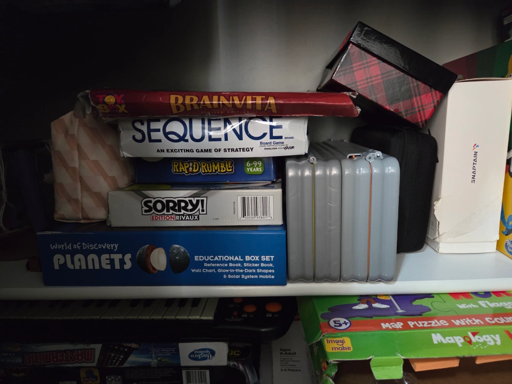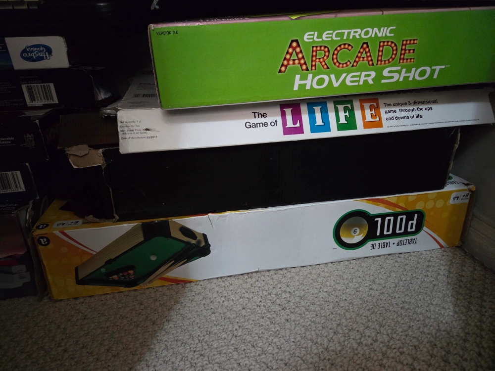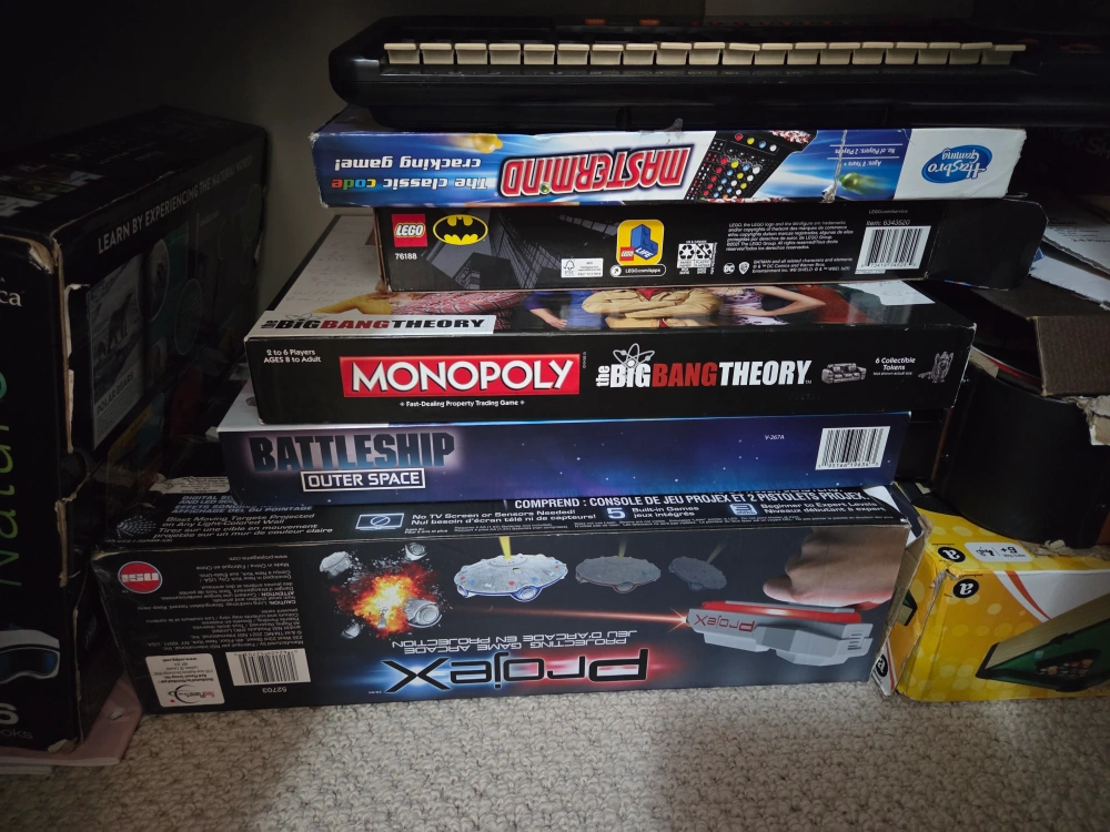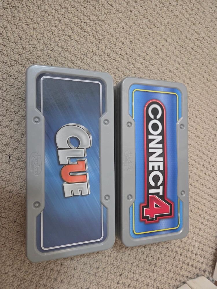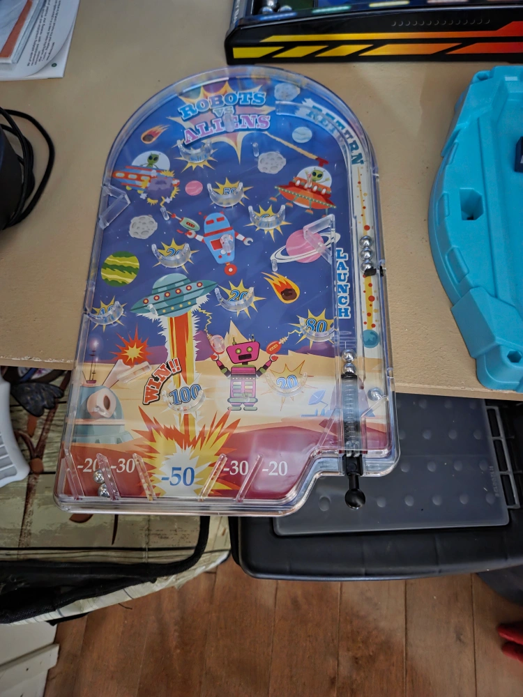 Selling a variety of kids' toys! There's a Robots Art Pins game, a World Map, an Arcade Alley Ball game, Clue, Connect 4, and other board games. Perfect for keeping the little ones entertained!