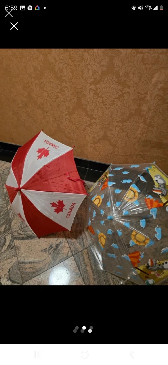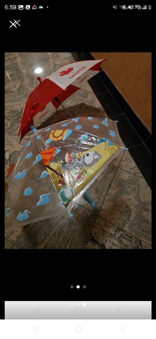 115Two umbrellas for kids! One is a clear umbrella with a cartoon design, and the other is a Canada-themed umbrella with the maple leaf