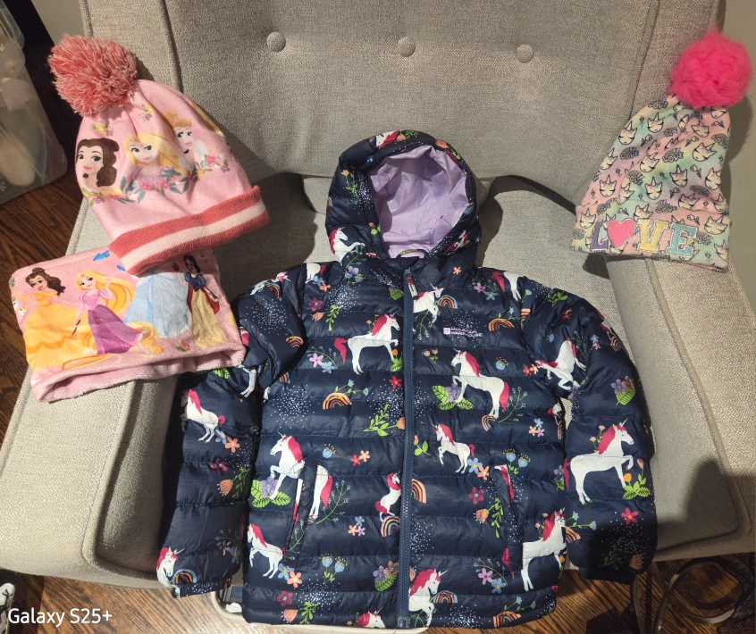 Kids Mountain Warehouse Unicorn Coat size 7-8, great for fall and spring weather in Canada. Super cute Disney Princess beanie and neck warmer set for kids! The beanie has a fun pompom on top, and both pieces feature lovely Disney Princess designs. Perfect for keeping your little one warm and stylish during the cooler months