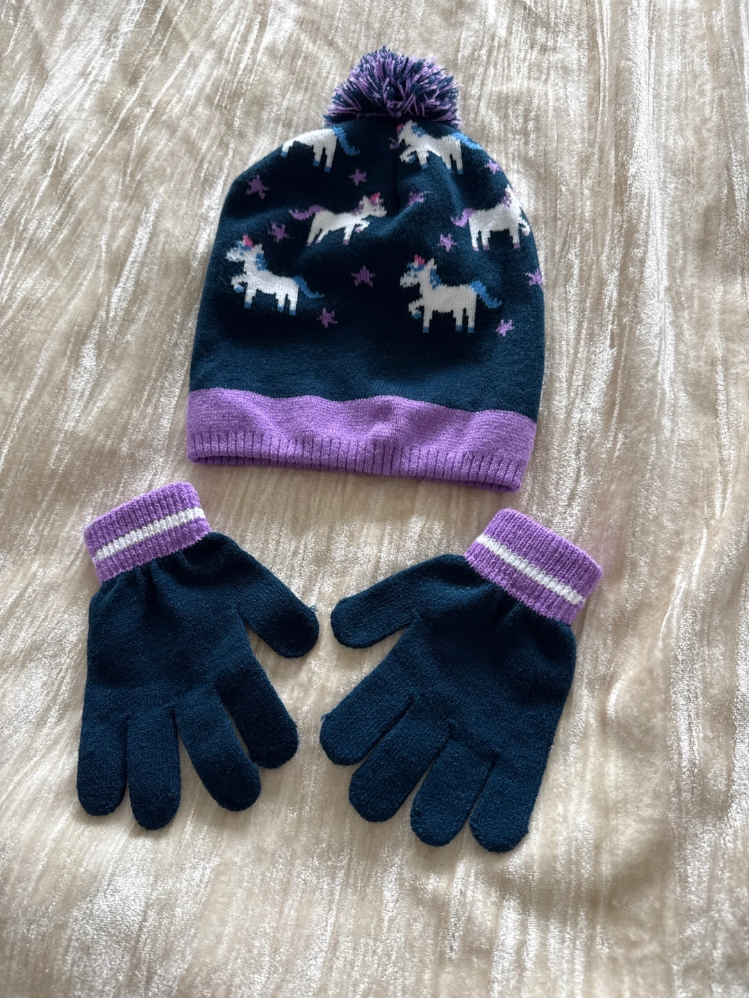 Cute kids winter hat and gloves set. Features a dark blue toque with purple trim and a white unicorn pattern. Matching gloves with purple and white accents. Perfect for keeping little ones warm during the colder months.