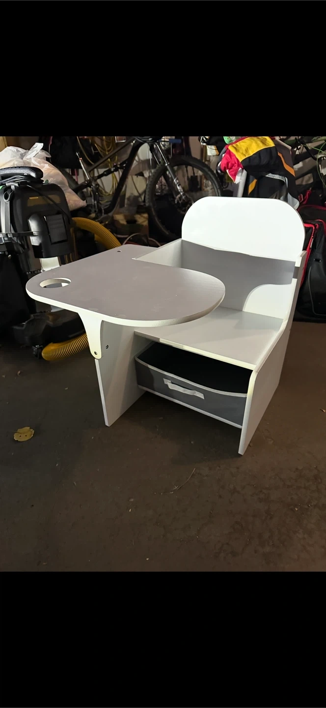 26Here's a cute activity chair for kids! It's white and grey, and comes with a little storage bin underneath the seat. The chair also features an attached table, perfect for drawing, snacking, or other fun activities