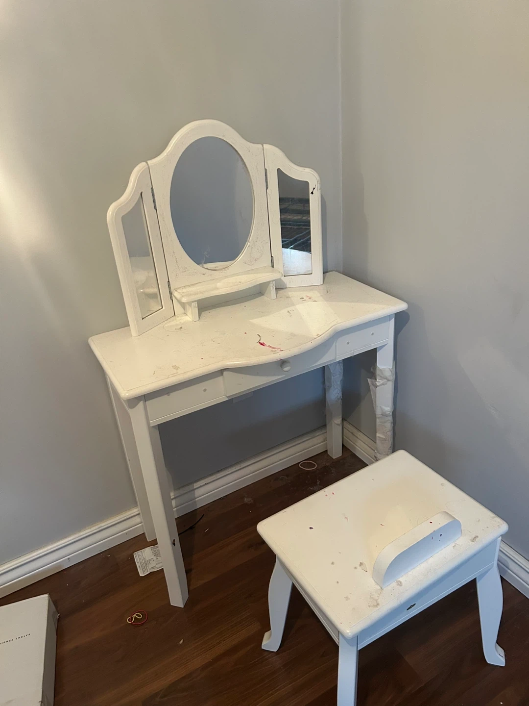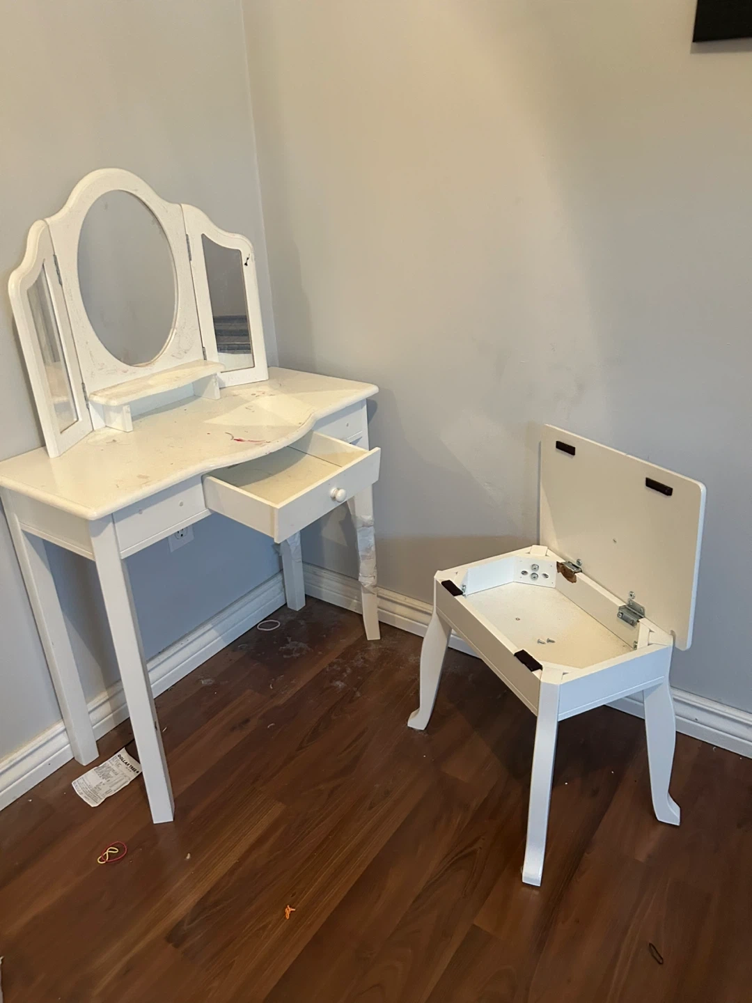 Selling a cute white vanity table with a matching stool! Perfect for a kid's room or small space. It has a tri-fold mirror and a small drawer for storage. The stool also has a lift-up seat with storage inside. It's in used condition, but still has lots of life left in it!