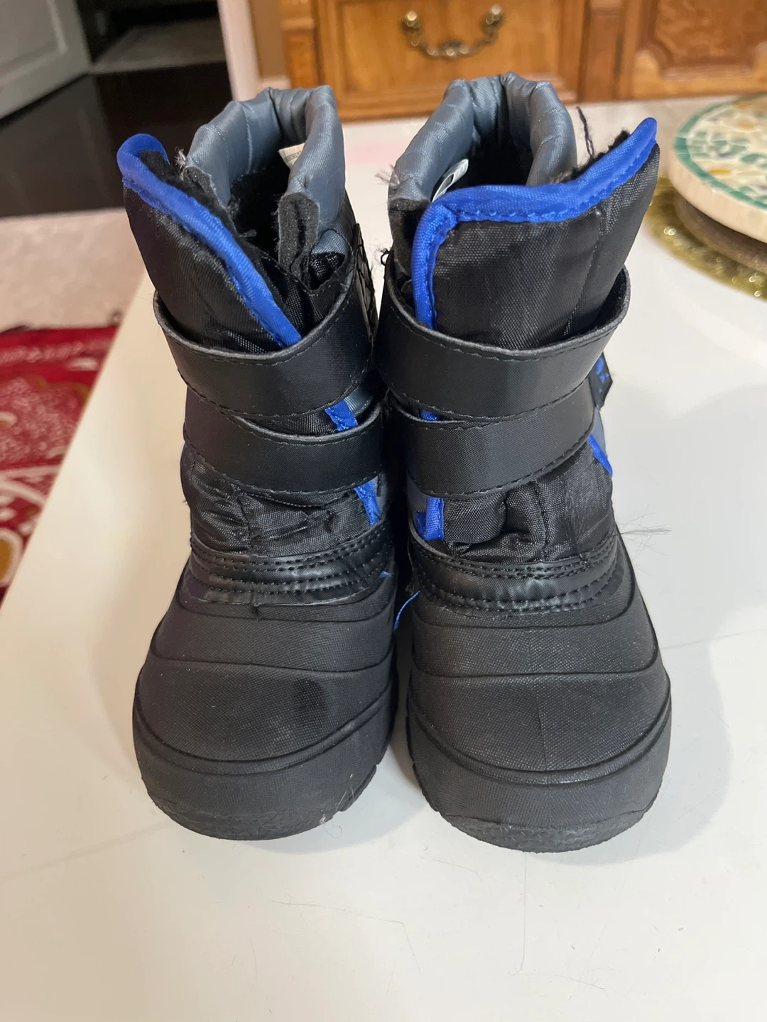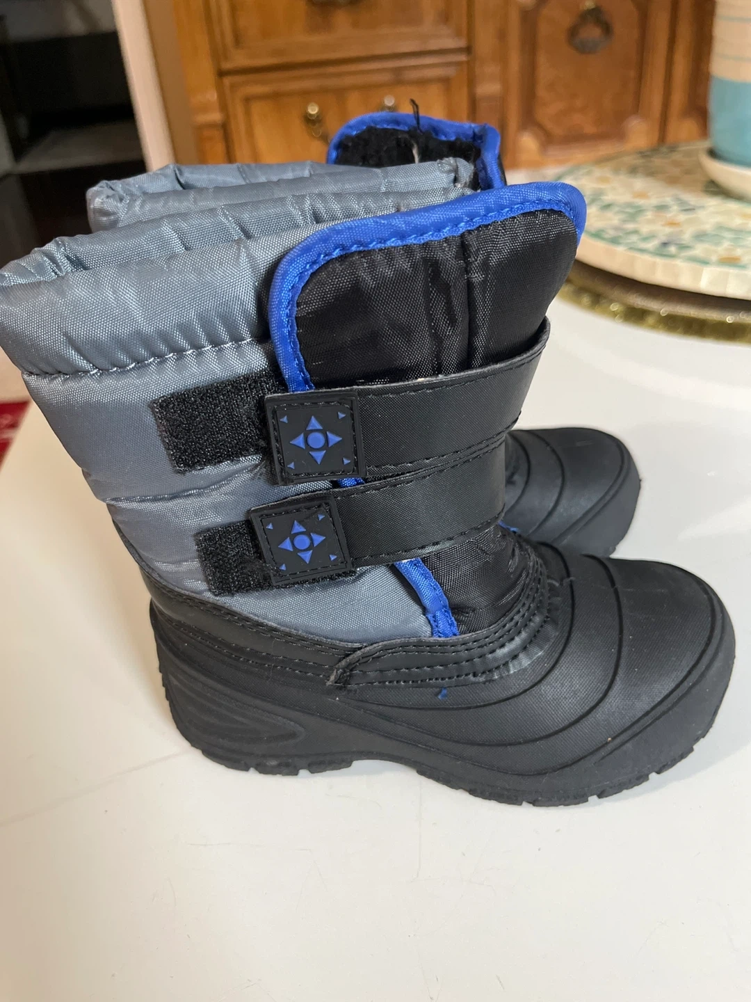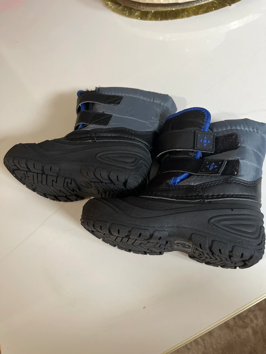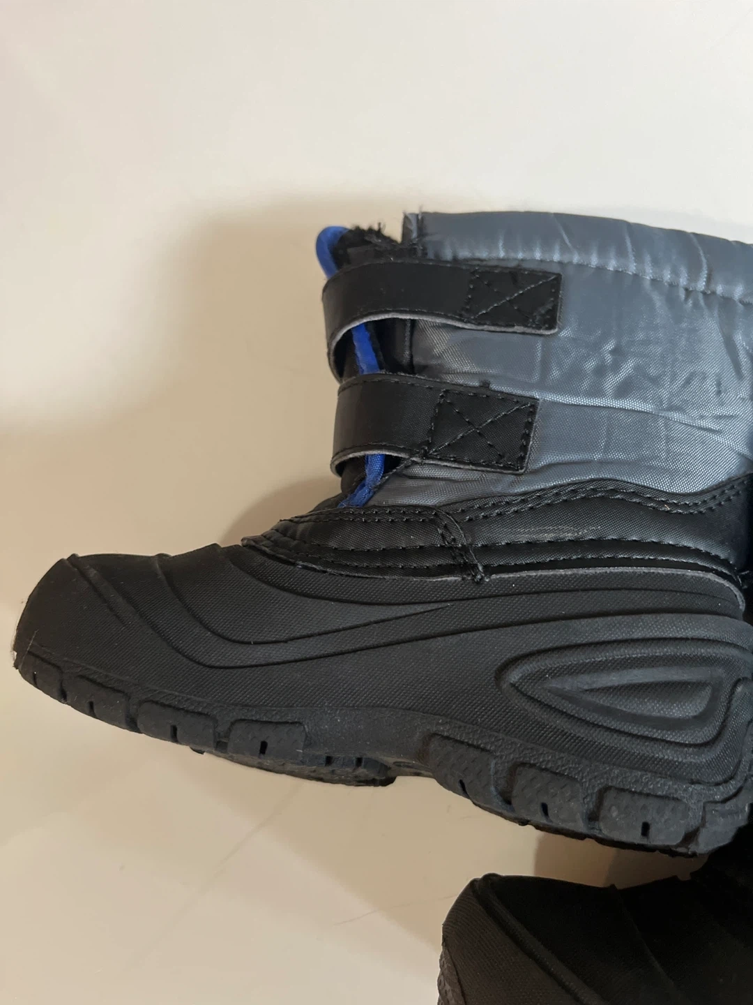 18Selling a pair of kids' winter snow boots in black and grey. They feature a velcro strap for easy fastening and a nice blue accent. Perfect for keeping little feet warm and dry this winter!