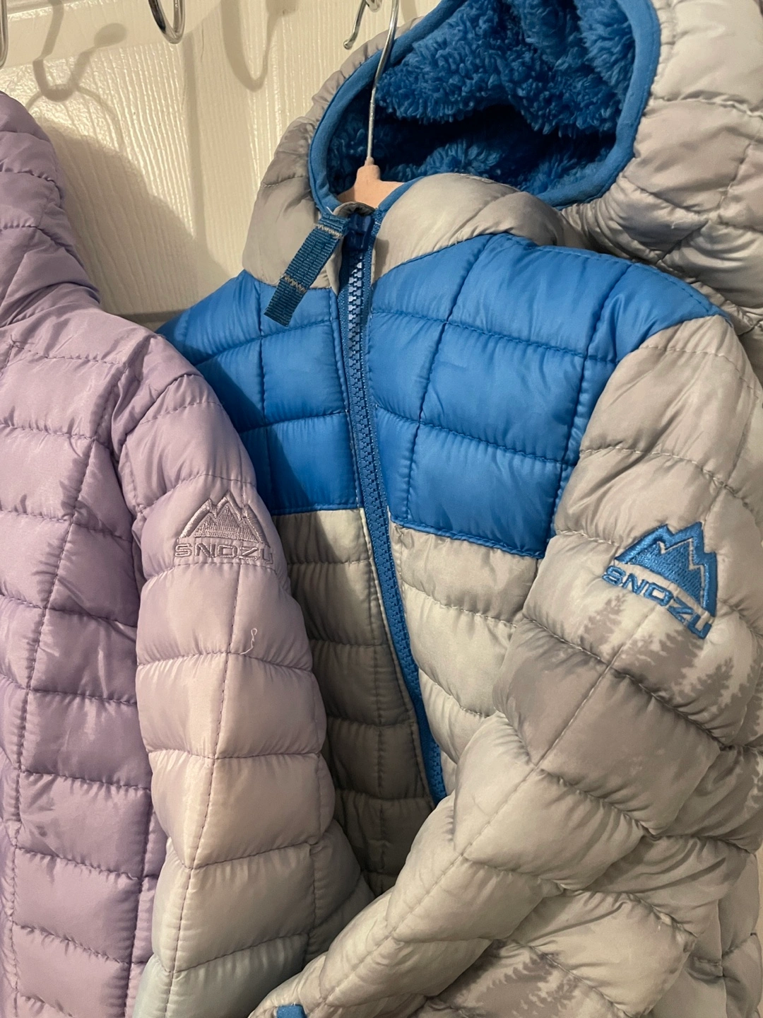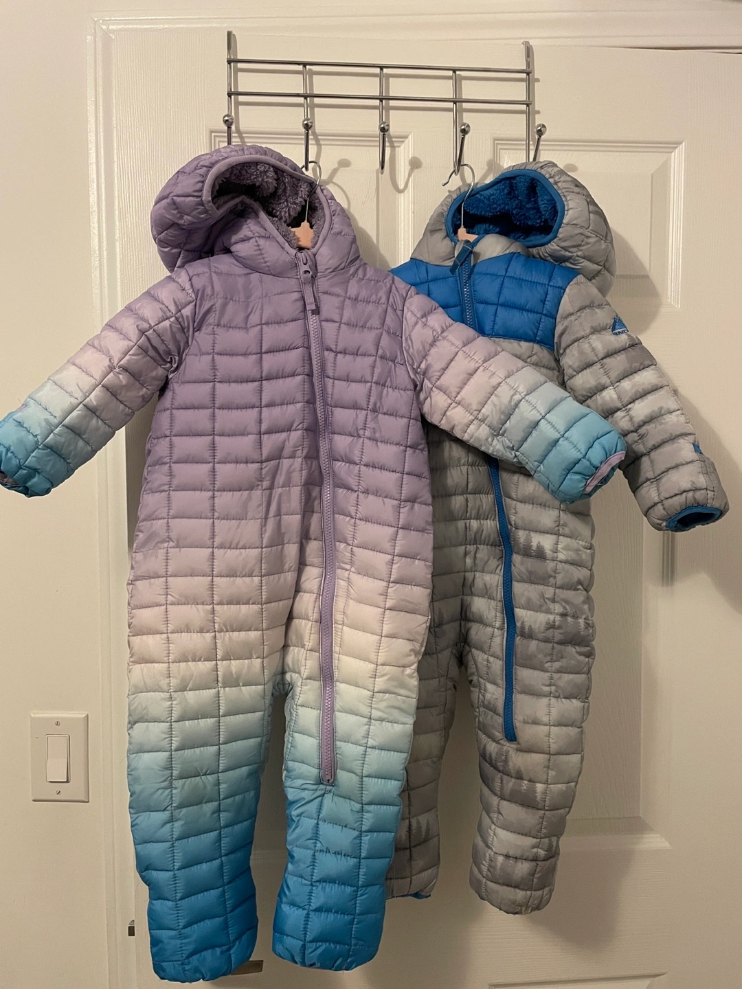 I'm offering a lovely winter snowsuit that's perfect for those chilly days. It looks like it has a hood and a zippered front. Designed with quilted patterns. They will keep your child warm and cozy throughout the winter.