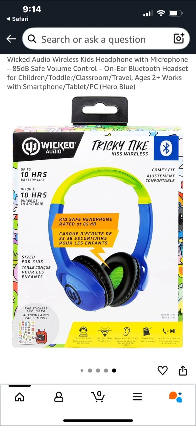 94These Wicked Audio Tricky Tike kids wireless headphone are perfect for your little one! Brand New In BOX (unopened). The headphones are rated at 85dB to protect kids' ears, feature up to 10 hours of battery life, and are sized for kids. Specifications: (Brand: Wicked Audio) * Wireless * Sized for Kids * Keeps Kids' Ears Safe * 85dB at 1kHz * Comfy Fit * Safe Volume Control * Mic and Track Control Safe Volume Control – On-Ear Bluetooth Headset for Children/Toddler/Classroom/Travel, Ages 2+ Works with Smartphone/Tablet/PC Sells for $40 plus taxes at WalMart (see pic) and around $30 at Amazon (see link below ). https://a.co/d/bZJ2njg I’m asking only $10 (or best offer ).