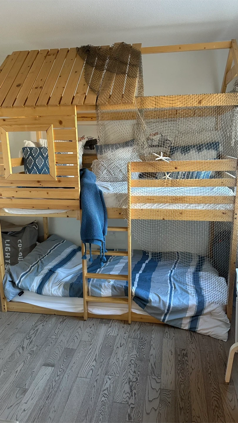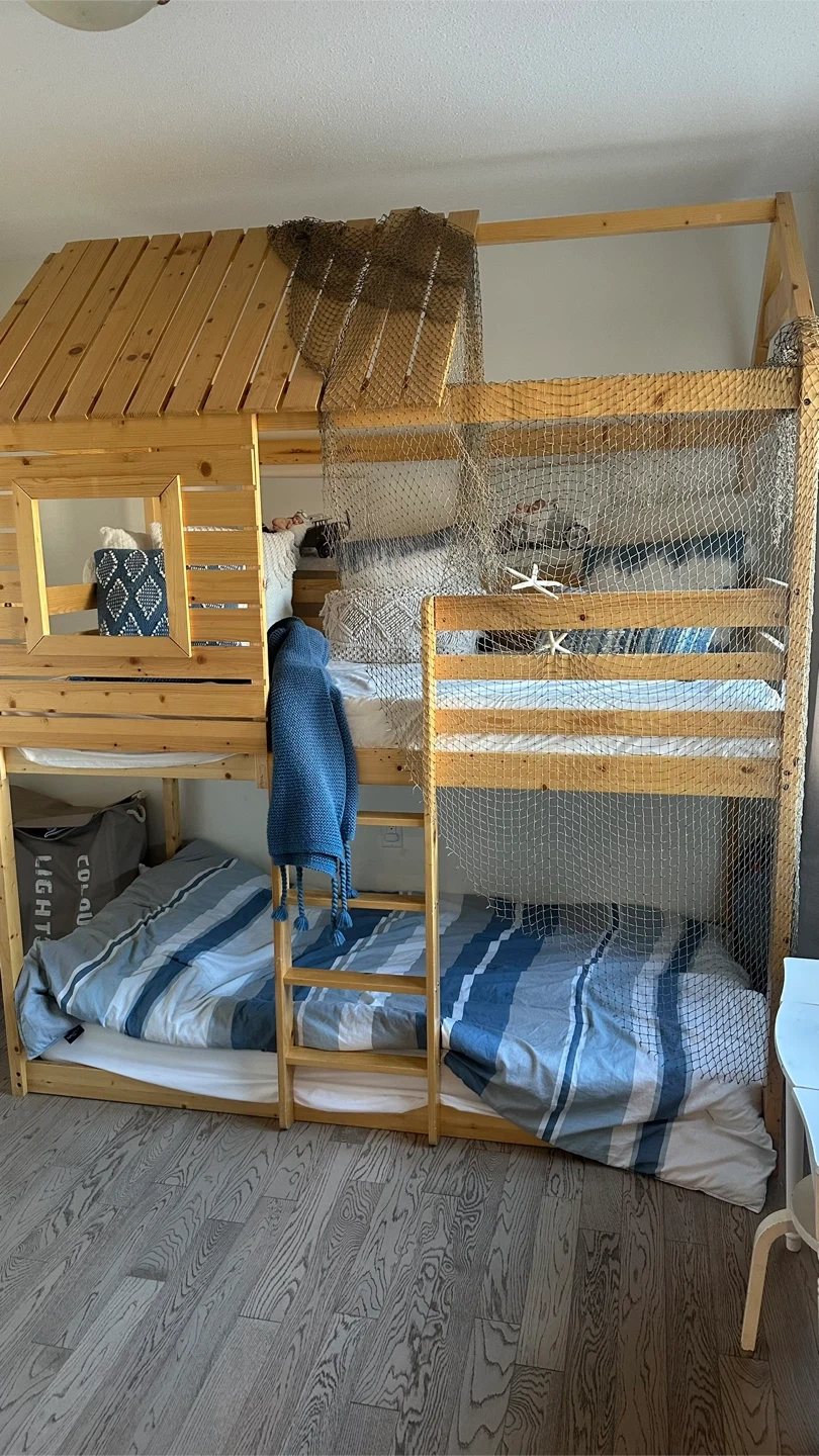 20Selling a cute wooden bunk bed, perfect for a kids' room! It has a fun, house-like structure on top and includes some nautical-themed decorations like a ship's wheel and life preserver. It's a great way to add a bit of adventure to bedtime! Top bed mattress is brand new Bottom bed mattress used Bunk bed dimensions Height -91 inch 84 inch wide 7 feet 43 depth Pillows not included 🛠Please Note: • Unassembly is not included. Buyer must bring tools and disassemble on site. • Pickup only from Oakville. • Buyer responsible for loading and transport.