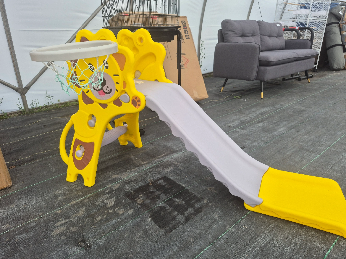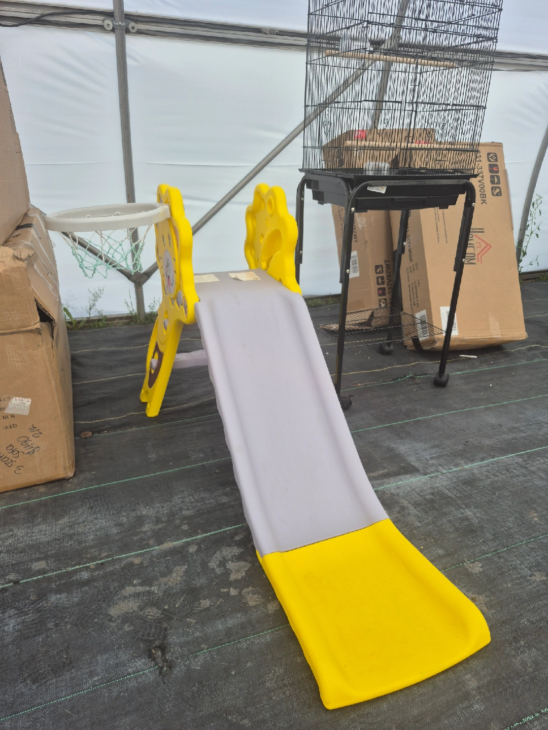 This fun yellow and grey slide is perfect for kids! It also comes with a basketball hoop for extra playtime. It's in good condition and ready for a new home.