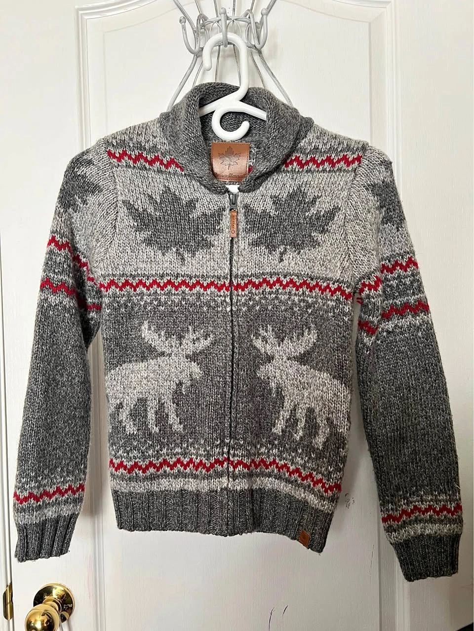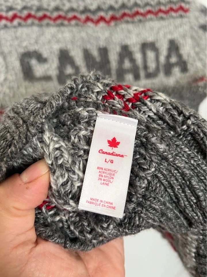 10Worn less than a handful of times for photos. Excellent condition winter themed Canadiana knit zipped sweater. Kids size Large.