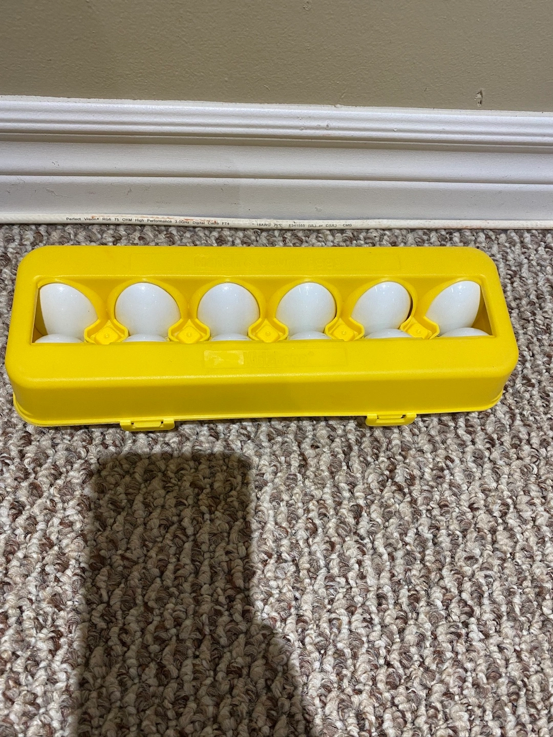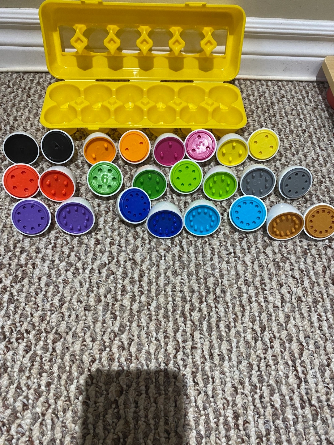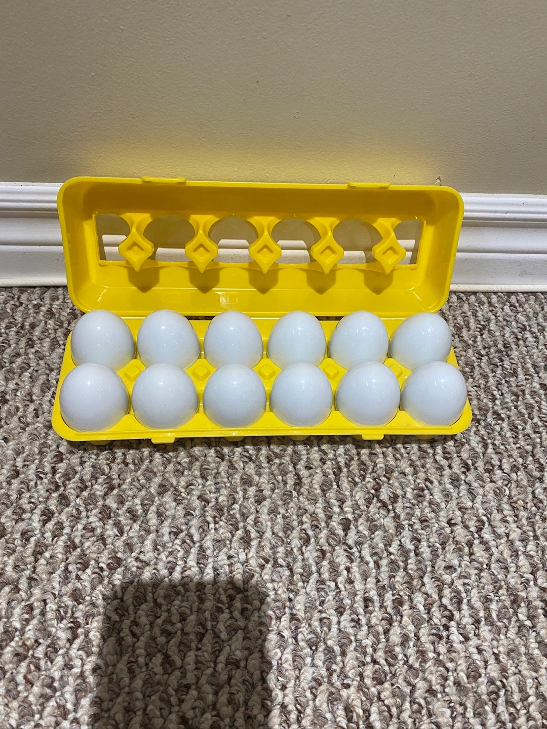 12Egg matching game. Includes a yellow egg carton with 12 eggs. Each egg has a different colour and pattern on the bottom.